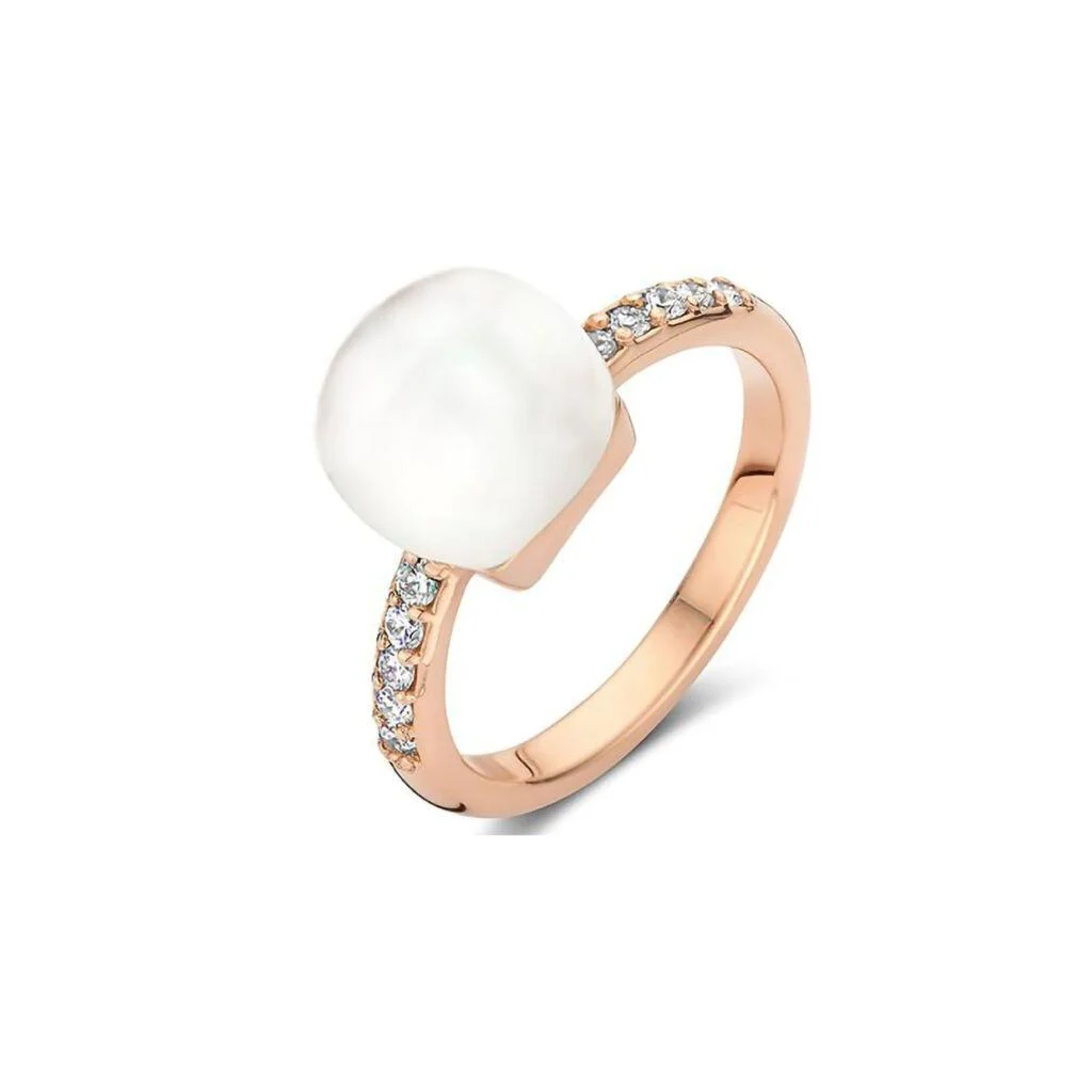 Dieser Ring ist in 750er Roségold gefertigt. Der Ringkopf ist besetzt mit einer Doublette (Bergkristall, Perlmutt) die zu einem Cabochon geschliffenen 6,00ct Edelstein verbunden sind. Dadurch entsteht einzigartiges Farbspiel. Der Cabochon Edelstein einen Durchmesser von 10 mm. In der Ringschiene sind 10 Diamanten im Brillant-Schliff mit zusammen zus. 0,25ct F-vsi gefasst. Die Ringweite beträgt 56,0.