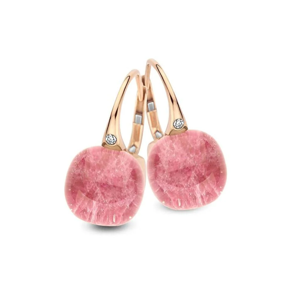 Ohrringe aus Roségold mit ,Bergkristall, Rubin, Perlmutt-Triplette und Diamanten.