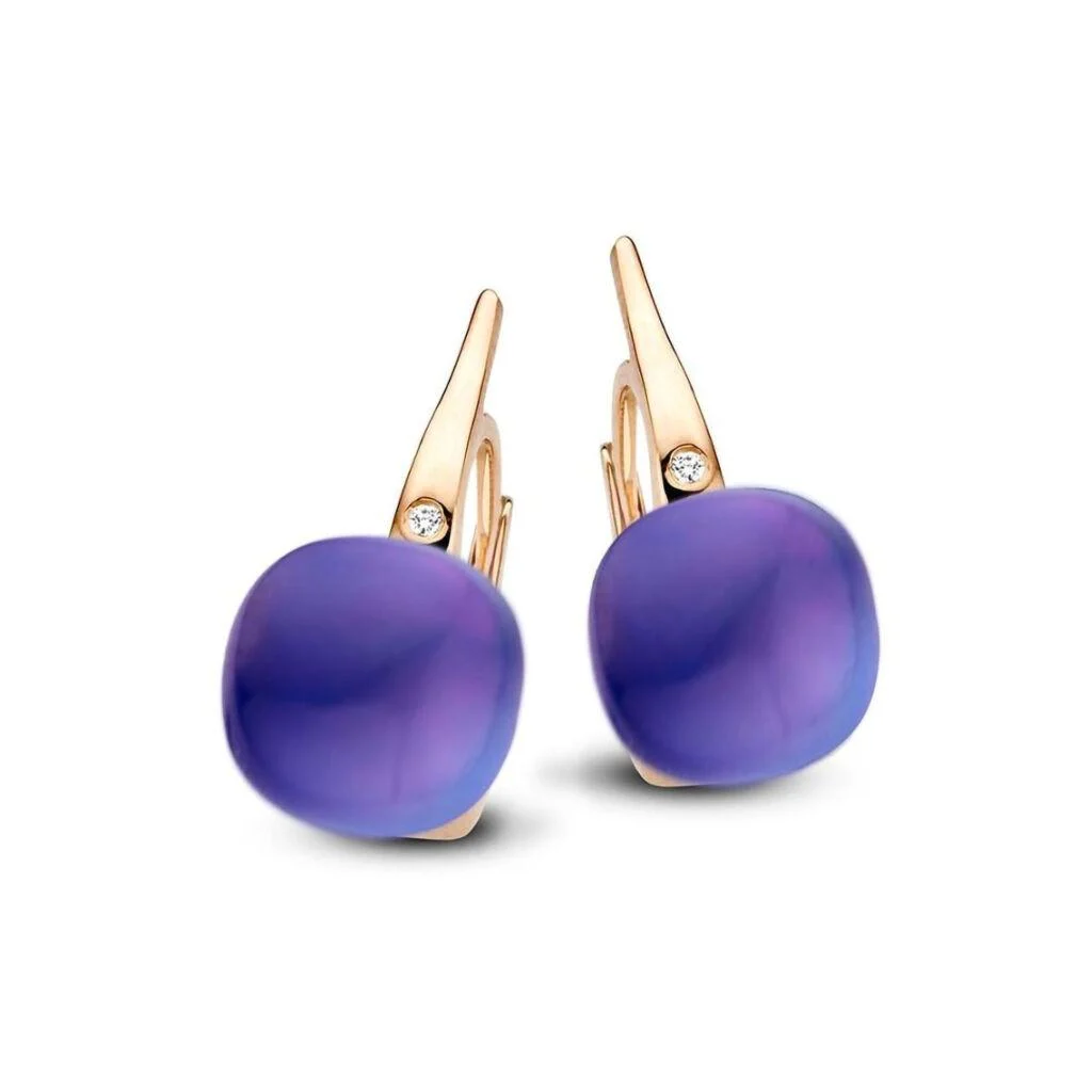 Ohrringe aus Roségold mit Amethyst, Lapis, Perlmutt -Triplette und Brillanten.