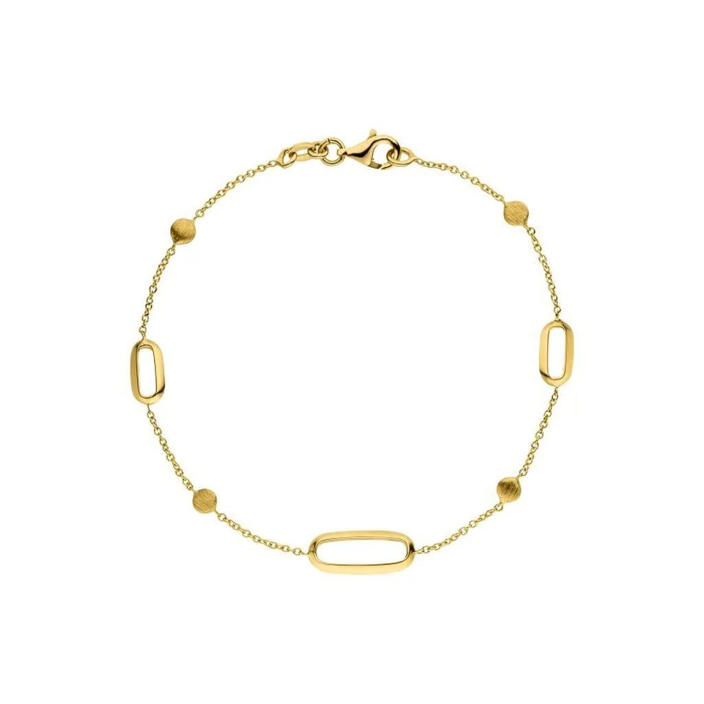 Dieses 19cm Armband aus 585er Gelbgold ist mehr als nur ein Schmuckstück – es ist ein Begleiter für jeden Tag. Mit seinem spiel aus glänzenden und matten Oberflächen fängt es das Licht auf eine besondere Weise ein und verleiht Ihrem Handgelenk eine edle, aber lässige Ausstrahlung. Die Kombination aus glatten, ovalen Elementen und den zart strukturierten Kugeln schafft einen modern-klassischen Look, der sowohl zu Jeans als auch zum Abendkleid passt.