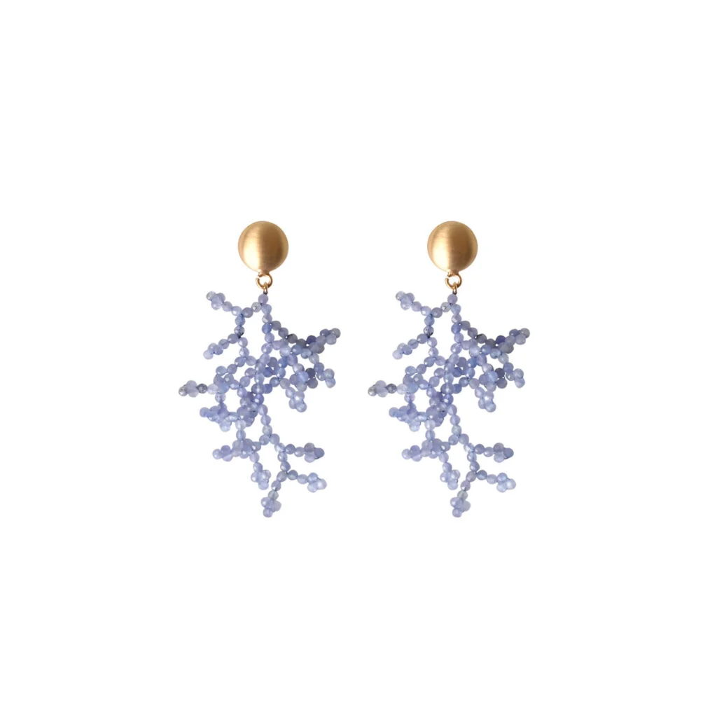 Lassen Sie sich von der außergewöhnlichen Eleganz der Rohm Ohrhänger Tanzanit, Boho Zweig, begeistern. Diese Ohrringe sind ein wahres Kunstwerk, das feine, zarte Verästelungen in einem organischen Zweig-Design präsentiert, kunstvoll besetzt mit blauen Tanzanitsteinen, die sanft das Licht einfangen. Die Kombination aus warmem, vergoldetem Silber und dem kühlen Blau des Tanzanits schafft einen atemberaubenden visuellen Kontrast, der sowohl modern als auch zeitgemäß ist.
