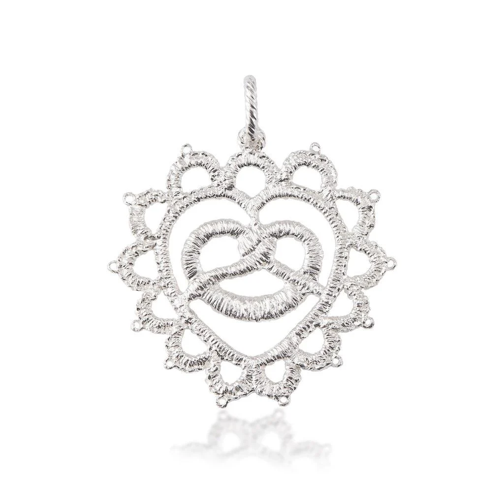 Der Anhänger Anna besticht durch seinen filigranen Cut-Out-Look. Hier rahmen die filigranen Schlingen ein Herz, in dessen Mitte eine Brezel gehalten wird – stilvoller Schmuck zum Dirndl oder für Liebhaberinnen bayrischer Lebenslust. Der Anhänger wirkt am besten an einem aus fein kordiertem Draht gefertigten Collierkettchen von Brigitte Adolph wie die 42 cm oder 45 cm lange XS-Chain. Die Gesamtlänge des Anhängers beträgt 3 cm.