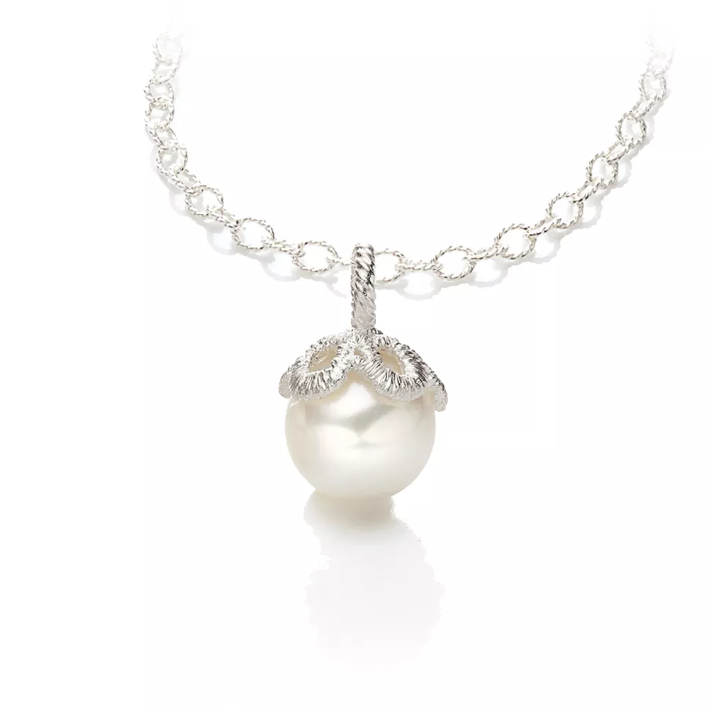 In der gleichnamigen Oper liebt Prinz Sternenschnuppe Frau Luna und jeder weiß warum: Ihr Perlenglanz und ihre sanfte Anmut sucht ihresgleichen. Die Schmuckstücke Frau Luna erinnern an die begehrte Mondfrau durch die hell schimmernden Süßwasserperlen und die femininen Rundungen der Fassung. Der Anhänger wirkt am besten an einem aus fein kordiertem Draht gefertigten Collierkettchen von Brigitte Adolph wie die 42 cm oder 45 cm lange XS-Chain. Die Gesamtlänge des Anhängers beträgt 1,5 cm.