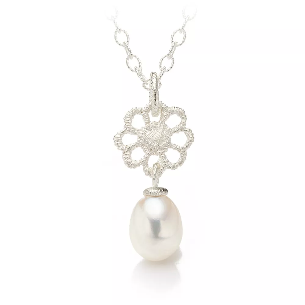 Jettchen zeigt eine kleine Blüte mit acht hauchzarten Blättchen. Bei den Ohrhängern und dem Kettenanhänger wird der zauberhafte Look von schimmernden Süßwasserperlen abgerundet. Wunderschön im Set als Brautschmuck oder für die Kommunion, Konfirmation oder Firmung. Der Anhänger wirkt am besten an einem aus fein kordiertem Draht gefertigten Collierkettchen von Brigitte Adolph wie die 42 cm oder 45 cm lange XS-Chain. Die Gesamtlänge des Anhängers beträgt 2,6 cm.