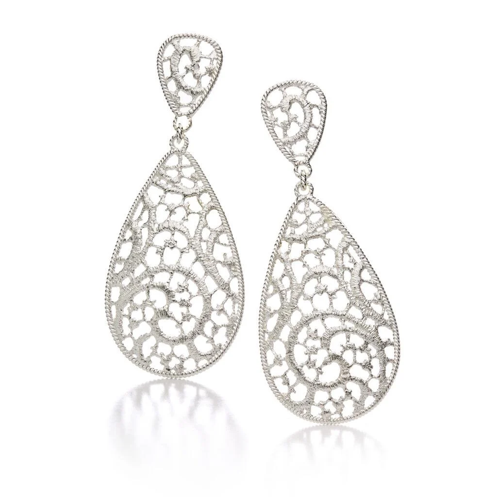Benannt nach der Bergnymphe Daphne aus der griechischen Mythologie zeigen die Schmuckstücke „Daphne“ runde Formen, feine Kordeln und filigrane Ornamente aus feiner Spitze. Der Liebesgott Eros hatte Apollon mit einem Pfeil getroffen. Daphne floh vor seinen Avancen und tauschte zu ihrem Schutz ihre weibliche Gestalt mit der eines Lorbeerbaumes. Die Ohrhänger „Daphne“ zeigen beides: eine in runder Form gelegte Kordel und verzweigte Fäden aus Silber. Die Ohrhänger, der Anhänger – an einer langen Kette getragen – und der passende Ring verleihen ihrer Trägerin eine elegante Ausstrahlung von femininer Leichtigkeit. Die Gesamtlänge des Ohrrrings beträgt 5,8 cm.