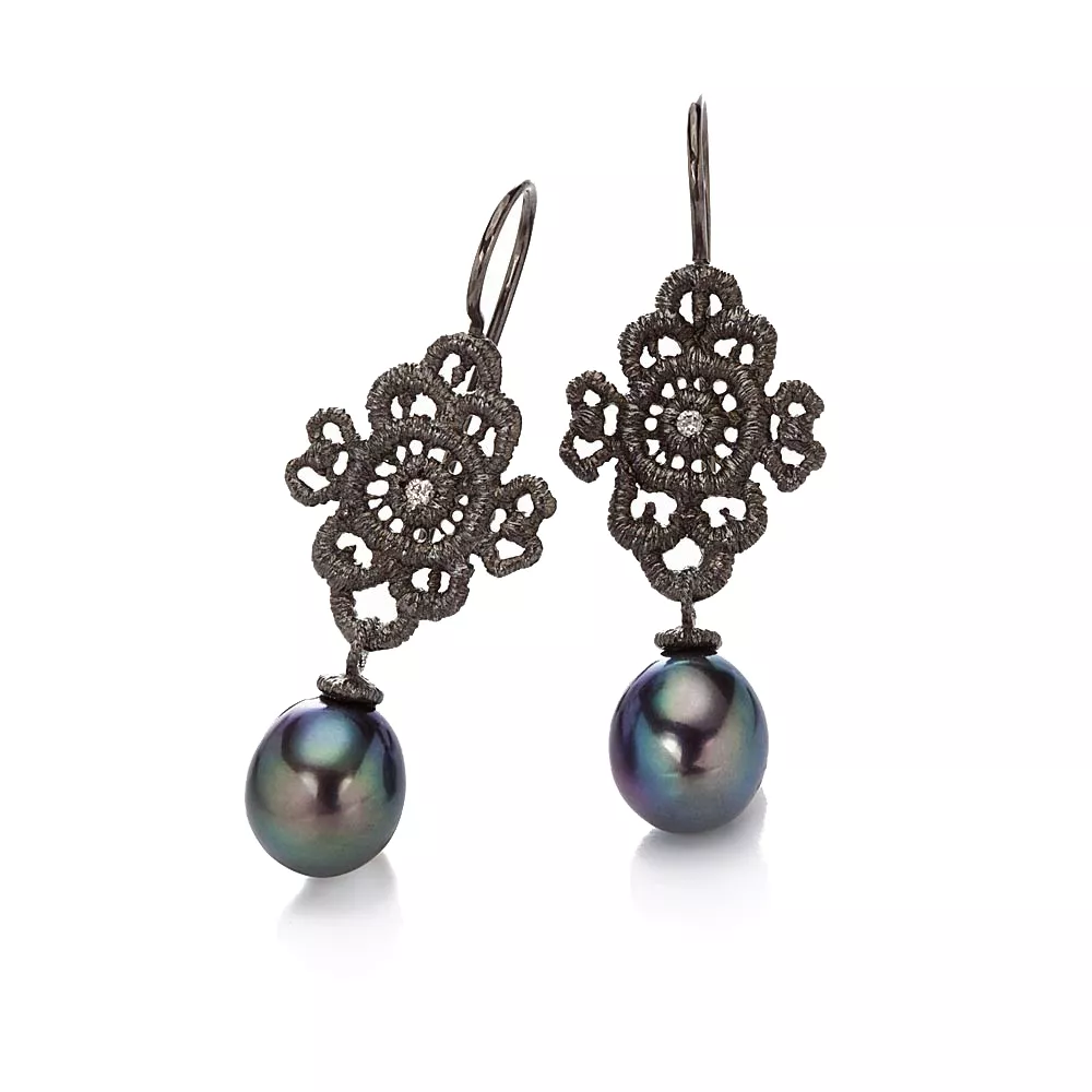 Die Mona Lisa auf dem weltberühmten Gemälde von Leonardo da Vinci wurde zu einer romantischen Ikone des Weiblichen. Spitzenschmuck-Designerin Brigitte Adolph versteht es auf eindrucksvolle Weise, den weichen, samtigen Ausdruck der Madonna Lisa in zarten Preziosen einzufangen. Spiegelt die Perle das weiche, weibliche Element, so fängt das elegante Spitzenmuster das Damenhafte der Adligen ein. Die Gesamtlänge beträgt 4,2 cm.