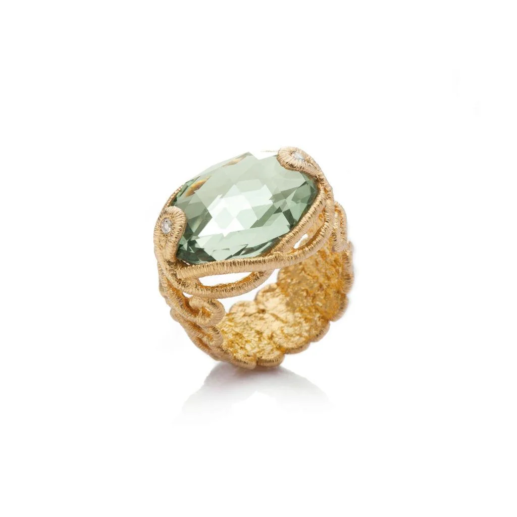 Wie filigrane Fäden erscheint die Struktur des Fingerschmeichlers Undine. Brigitte Adolph fertigt Schmuck, der wie Spitze aussieht, jedoch aus massivem Edelmetall besteht. Mit filigraner Leichtigkeit und dekorativer Transparenz erzählt sie in der Linie Undine die Geschichte einer Wassernymphe. Der facettierte, grün schimmernde Prasiolith ist der besondere Eyecatcher, flankiert von zwei champagnerfarbenen Brillanten. Der Ring hat eine Breite von 16 mm.