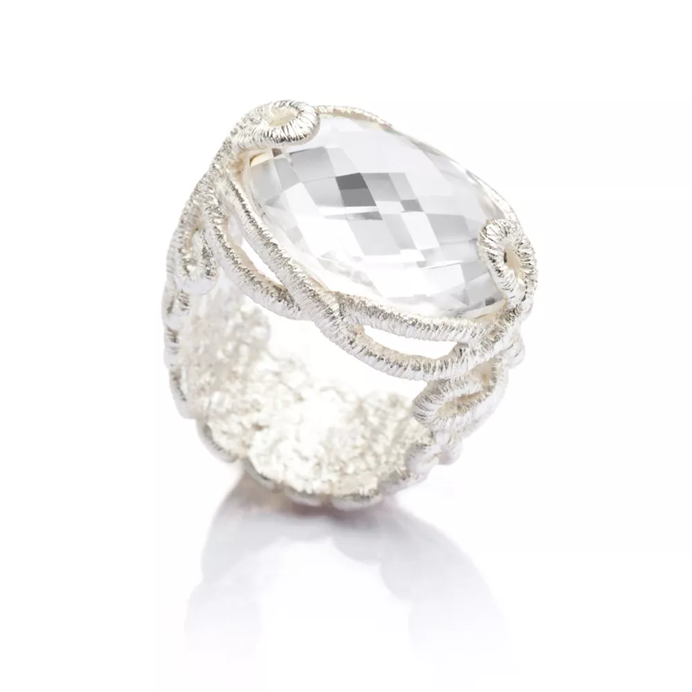Wie filigrane Fäden erscheint die Struktur des Fingerschmeichlers Undine. Brigitte Adolph fertigt Schmuck, der wie Spitze aussieht, jedoch aus massivem Edelmetall besteht. Mit filigraner Leichtigkeit und dekorativer Transparenz erzählt sie in der Linie Undine die Geschichte einer Wassernymphe. Der facettierte, tief schimmernde Bergkristall ist der besondere Eyecatcher. Der Ring hat eine Breite von 16 mm.
