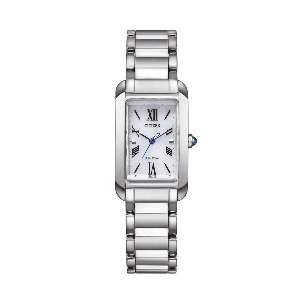 Die Citizen EW5620-55A ist eine stilvolle Damenuhr, die mit ihrer klaren Linienführung und hochwertigen Verarbeitung zeitlose Klasse verkörpert. Ihr rechteckiges Edelstahlgehäuse und das dazu passende silberfarbene Gliederarmband sorgen für eine elegante Optik und hohen Tragekomfort. Die Kombination aus mattierten und polierten Flächen verleiht der Uhr eine feine Balance zwischen Zurückhaltung und Raffinesse. Das weiße Zifferblatt mit römischen Ziffern bei 12, 2, 4, 6, 8 und 10 Uhr verleiht der Uhr einen klassischen Touch, während die feinen, gebläuten Zeiger ein stilvolles Detail setzen. Die dezente Minuterie entlang des Randes sorgt für eine präzise Ablesbarkeit. Die rechteckige Form des Gehäuses bringt eine feminine Note mit einem Hauch von Vintage-Charme ins Spiel – ideal für Frauen mit Sinn für Tradition und Qualität.