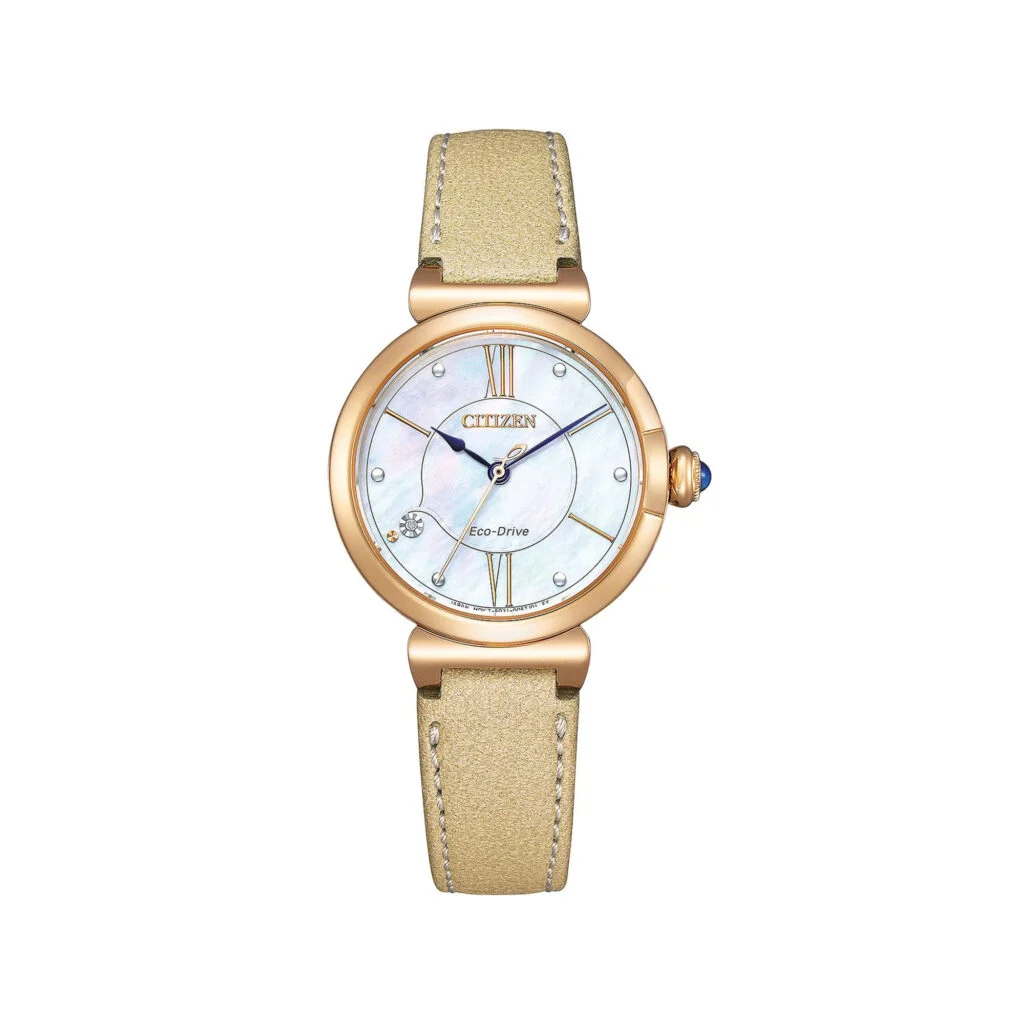 Die Citizen EM1073-18D vereint sanfte Farben, luxuriöse Details und moderne Technologie in einer harmonischen Damenuhr. Das schimmernde Perlmutt-Zifferblatt mit goldfarbenen römischen Ziffern, funkelnden Kristall-Akzenten und einem echten Diamanten bei 8 Uhr verleiht dieser Uhr einen besonders femininen und edlen Charakter. Blaue Zeiger und ein goldfarbenes Gehäuse setzen stilvolle Kontraste und runden das Gesamtbild perfekt ab. Ein besonderes Highlight ist die geschwungene Krone mit Cabochon und Ziersteinbesatz, die der Uhr einen Hauch von Vintage-Charme verleiht. Das zart glänzende, beigefarbene Lederarmband sorgt für hohen Tragekomfort und ein elegantes Finish.