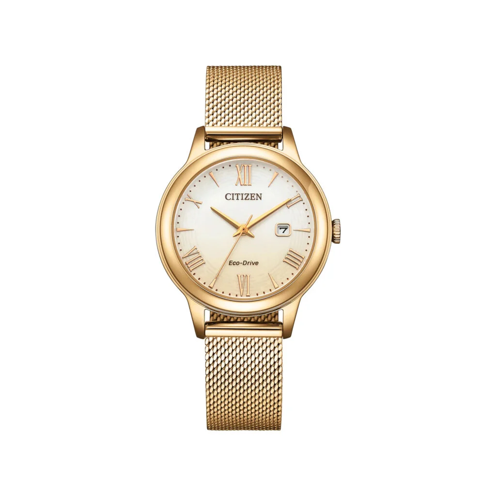 Die Citizen EW2623-70P ist eine elegante Damenuhr, die modernes Design mit innovativer Technologie vereint. Mit einem Gehäusedurchmesser von 31 mm und einer Höhe von 9 mm präsentiert sich die Uhr in einem schlanken Profil, das sich angenehm am Handgelenk trägt. Das Gehäuse sowie das Milanaise-Armband bestehen aus goldfarbenem Edelstahl und verleihen der Uhr eine zeitlose Eleganz. Das weiße Zifferblatt ist mit römischen Ziffern und schlanken Indizes versehen, die eine klare Ablesbarkeit gewährleisten. Ein Datumsfenster auf der 3-Uhr-Position ergänzt die Funktionalität. Geschützt wird das Zifferblatt durch kratzfestes Kristallglas, das für Langlebigkeit sorgt.