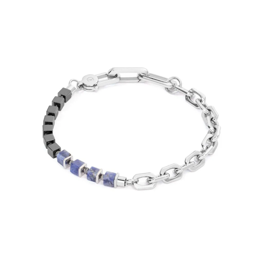 Dieses Unisex Fusion Armband in blau – aus der For You & Me Kollektion – im asymmetrischen Design, vereint ikonische GeoCUBES® aus schimmerndem Hämatit und ausdruckstarkem Sodalith mit glänzendem Edelstahl zu einem lässig-eleganten, asymmetrischen Look. Besonderes Highlight sind die filigranen, grauschwarz funkelnden Rohdiamanten, die zwischen den Elementen hervorschimmern. Diese machen jedes Armband zu einem echten Unikat, denn jeder Rohdiamant ist so schön und einzigartig wie die Natur ihn schuf.