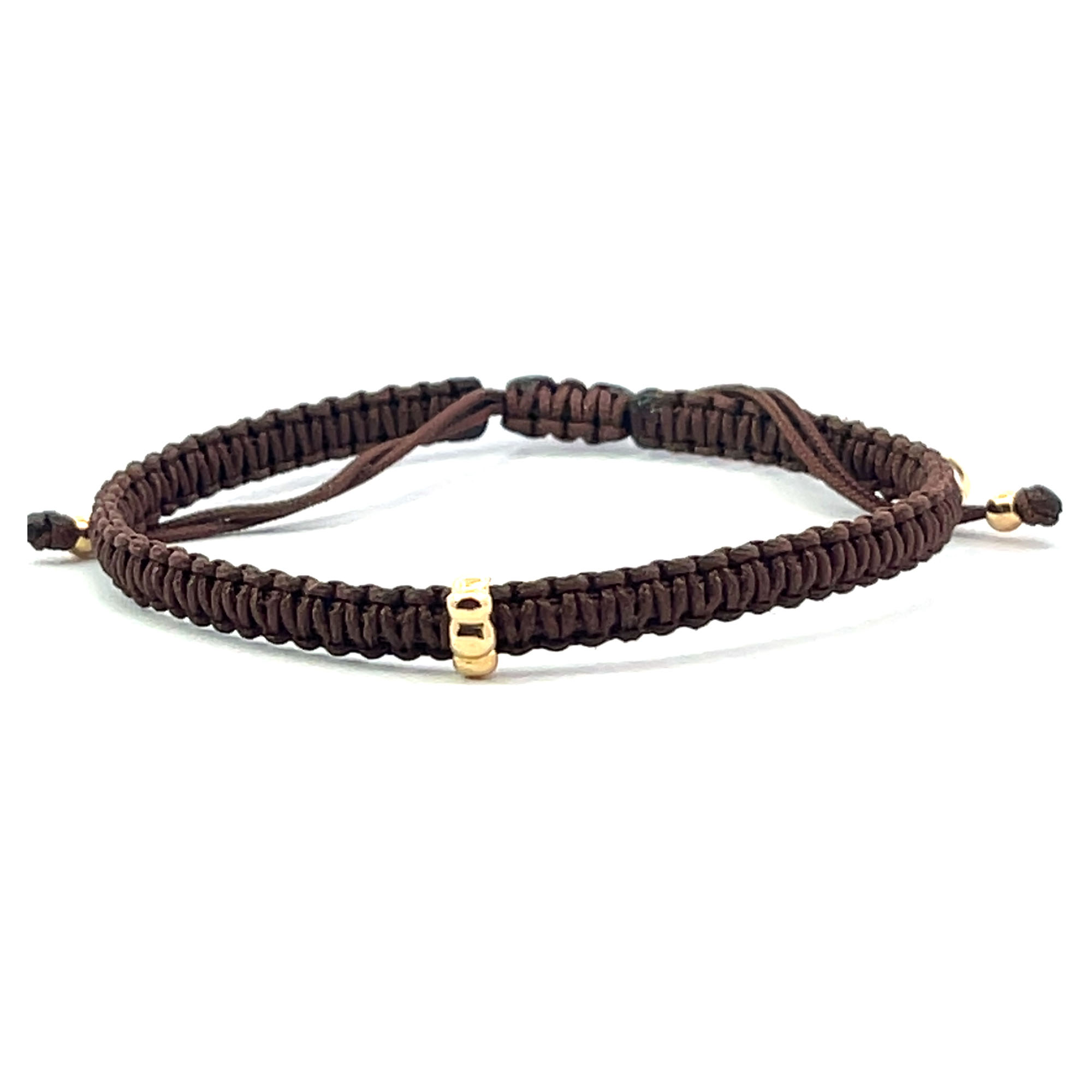 Edles Makramee-Armband in warmem Braun mit feinem Element aus 750 Gelbgold. Handgefertigt, 16,5 cm lang und individuell verstellbar – ein stilvolles Accessoire, das natürliche Eleganz, hochwertige Handarbeit und modernen Luxus harmonisch vereint.