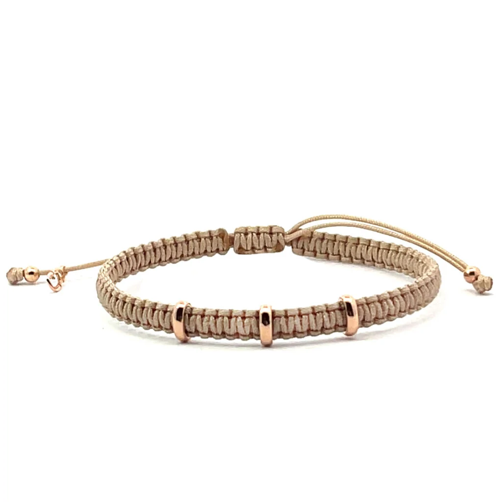 Sanft, stilvoll und von zeitloser Schönheit – dieses fein handgefertigte Makramee-Armband vereint dezente Eleganz mit luxuriöser Leichtigkeit. Das zart beige Band unterstreicht die natürliche Ausstrahlung, während die polierten Elemente aus 750 Roségold warm schimmern und einen Hauch von Exklusivität verleihen. Mit seiner Länge von 15,5 cm und dem verstellbaren Zugverschluss sitzt das Armband angenehm und sicher am Handgelenk. Ob solo getragen oder im modernen Layer-Look – es ist das perfekte Accessoire für jeden Anlass. Dieses Schmuckstück steht für Harmonie, Stil und Persönlichkeit – ein dezentes Statement für Menschen, die feine Handwerkskunst und zurückhaltenden Luxus zu schätzen wissen.