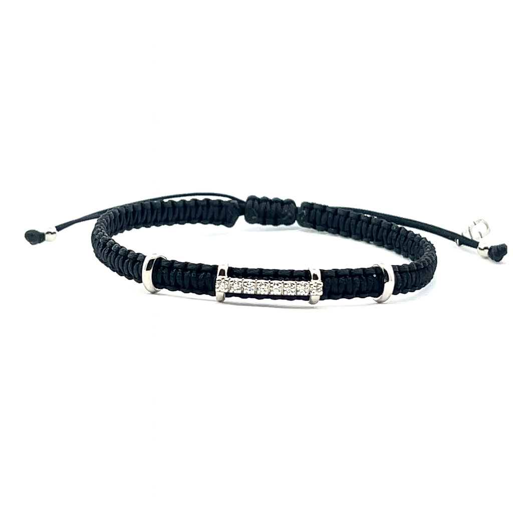 Edles Makramee-Armband in Schwarz mit Steg aus 750 Weißgold und acht funkelnden Brillanten (0,160 ct F/VSI). Handgefertigt, 16,5 cm lang und verstellbar – ein luxuriöses Schmuckstück, das Eleganz, Stärke und modernen Stil perfekt vereint.