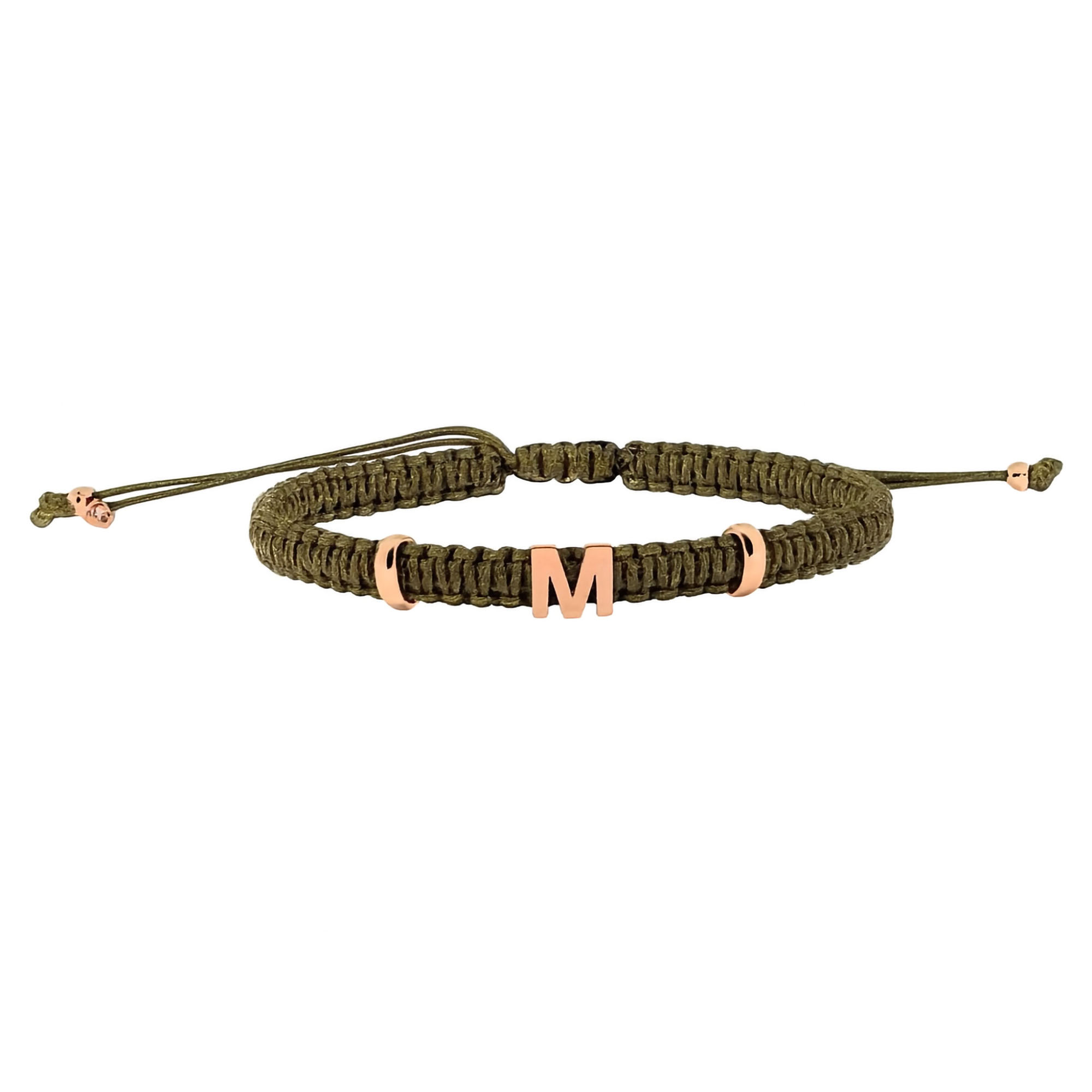 Feines Makramee-Armband in warmem Khaki mit edlen Applikationen und Buchstabe „M“ aus 750 Roségold. Handgefertigt, 15,5 cm lang und verstellbar – ein stilvolles Accessoire, das Persönlichkeit, Eleganz und moderne Leichtigkeit perfekt vereint.