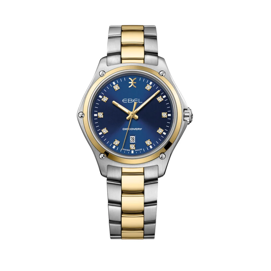 Die Ebel Discovery Damenuhr ist ein Hingucker für anspruchsvolle Frauen, die Wert auf zeitlose Schönheit und Schweizer Präzision legen. Das 33 mm Gehäuse aus Edelstahl und 18K Gelbgold vereint sportiven Charme mit luxuriösem Glanz – perfekt für jeden Anlass. Das tiefblaue Zifferblatt, verziert mit 11 funkelnden Diamanten (0,072 Karat), strahlt edle Feminität aus und wird durch das innenseitig entspiegelte Saphirglas optimal geschützt.