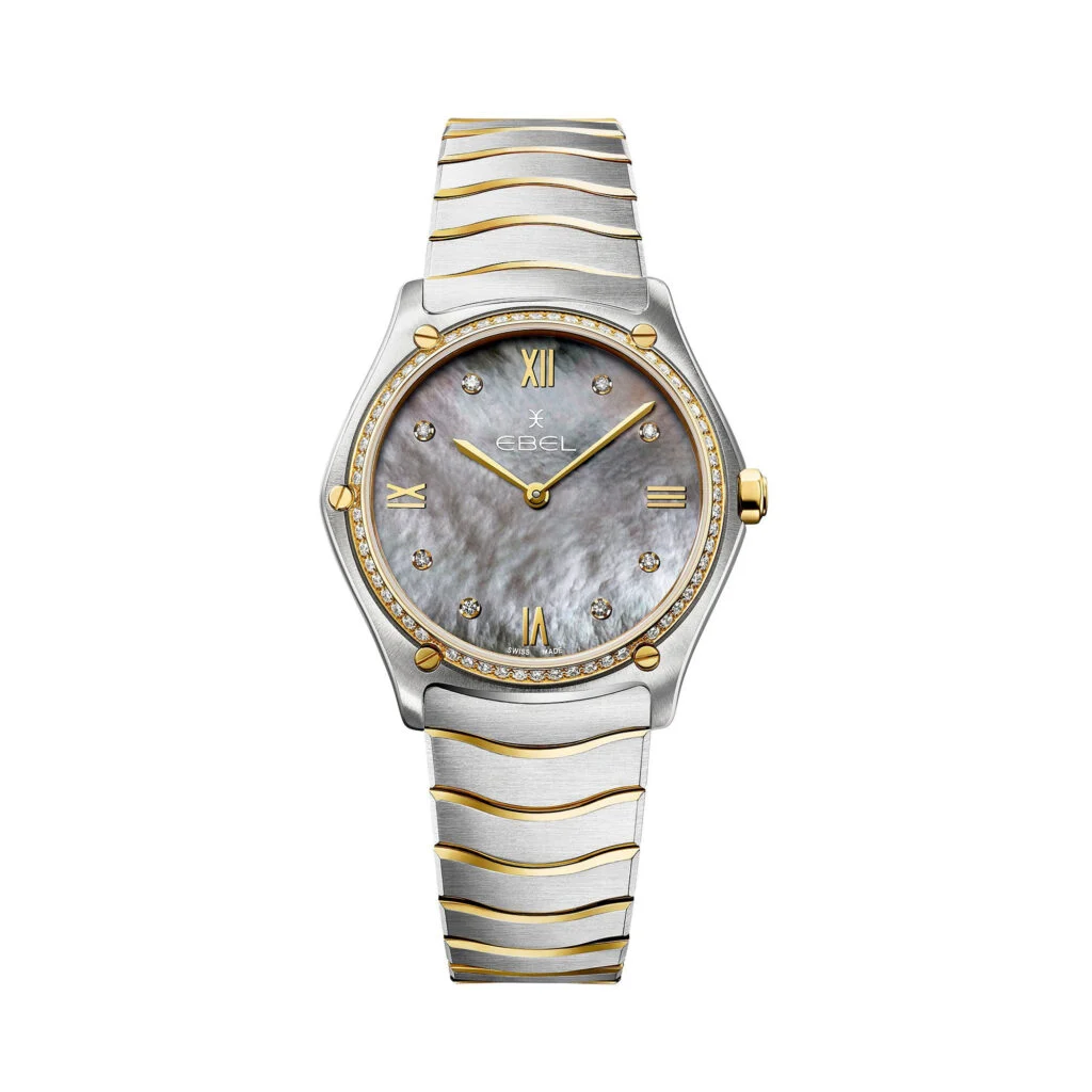 Die 1911 in La Chaux-de-Fonds gegründete Uhrenmanufaktur Ebel kombiniert in ihren Uhrenkreationen schweizerische Präzision mit einem herausragenden Gespür für Design und Eleganz. Mit der exklusiven Damenuhr von Ebel setzt du ein eindrucksvolles Statement. Das SPORT CLASSIC-Modell überzeugt durch sein ansprechendes Design, das spielend leicht jedes Outfit aufwertet. Das silberne Gold und Edelstahl-Armband bildet eine harmonische Ergänzung zum klassisch-modernen Stil der Uhr mit Edelstahl-Gehäuse und bietet höchsten Tragekomfort. Durch den Gehäusedurchmesser von 33 mm ist die SPORT CLASSIC vor allem für zarte Handgelenke die richtige Wahl. Das graue Zifferblatt mit Markierungen fügt sich gekonnt in das Gesamtdesign ein. Die 8 funkelnden Diamanten auf dem Zifferblatt perfektionieren die extravagante Optik auf glamouröse Art. Die Lünette aus Gelbgold wird von Brillanten zum Funkeln gebracht und verleiht dem Design eine glamouröse Note. Für den Schutz des Zifferblattes wurde der „König der Uhrengläser“ verwendet: Saphirglas. Dieses synthetische Material ist so gut wie nicht zu zerkratzen und äußerst widerstandsfähig. Saphirglas ist außerdem quasi immun gegen Stöße und Schläge. Im Inneren tickt ein robustes Eta-Quarzuhrwerk, welches zuverlässige Präzision garantiert. Der Zeitmesser ist wasserdicht bis 5 bar und kann deshalb ganz unbesorgt auch beim Duschen getragen werden. Die Faltschließe verspricht nicht nur sicheren Halt, sondern auch gute Verstellbarkeit.