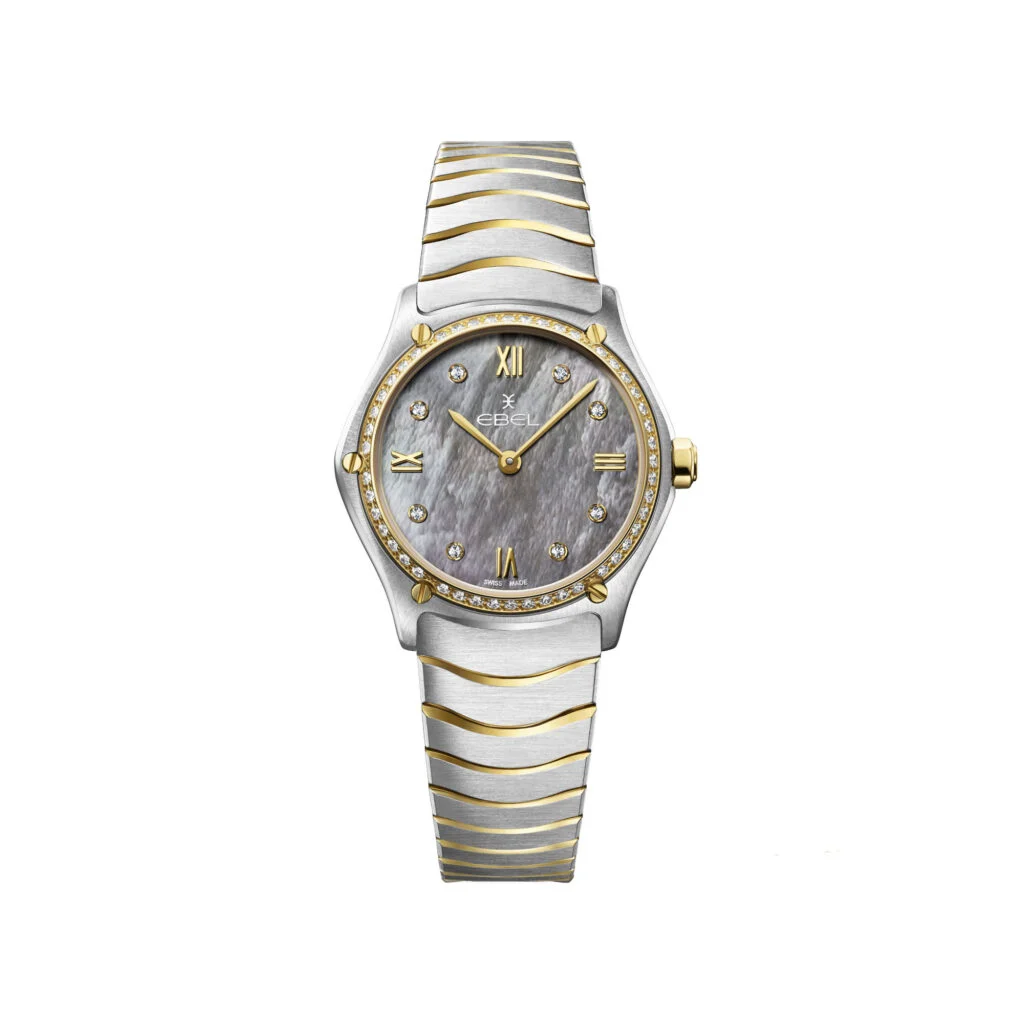Die EBEL Sport Classic Damenuhr vereint zeitlose Eleganz mit schweizer Handwerkskunst. Ihr 29 mm Gehäuse aus Edelstahl und 18K Gelbgold ist mit 47 funkelnden Diamanten (0,3055 ct.) verziert und strahlt pure Exklusivität aus. Das graue Perlmutt-Zifferblatt mit applizierten römischen Ziffern und 8 Diamanten (0,052 ct.) verleiht der Uhr einen edlen, femininen Charme. Das innenseitig entspiegelte Saphirglas sorgt für beste Ablesbarkeit.