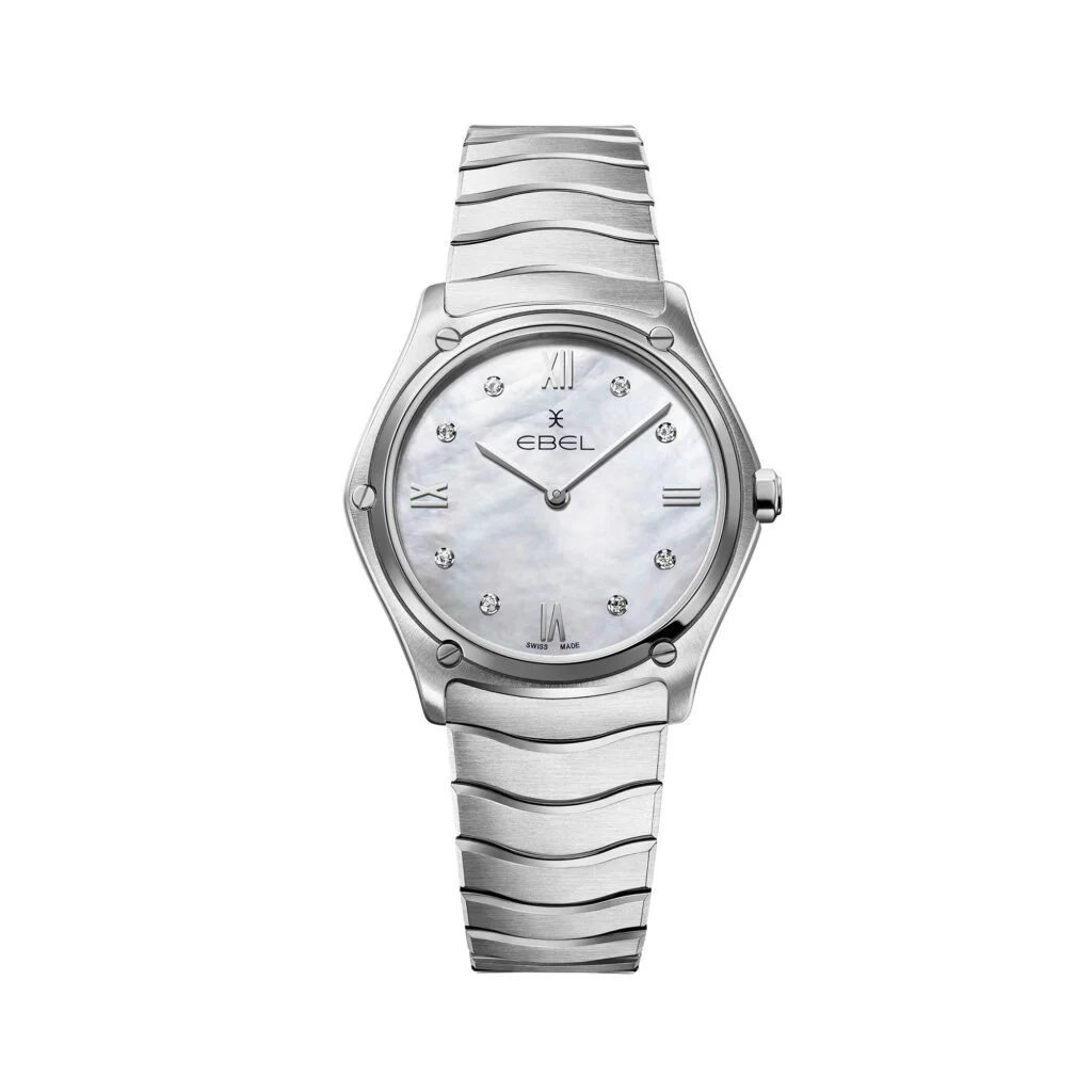 Die Ebel Sport Classic steht seit Jahrzehnten für zeitlose Eleganz, fließendes Design und feinste Schweizer Uhrmacherkunst. Ihr charakteristisches, sechseckiges Gehäuse mit integrierten Bandanstößen und der markanten Wellenarmband-Optik ist ein Designklassiker – stilvoll, modern und zugleich dezent.Das fein gebürstete und polierte Edelstahlgehäuse ist schlank gearbeitet und liegt angenehm flach am Handgelenk. Goldfarbene Akzente auf Lünette, Indizes und Zeigern verleihen der Uhr eine edle Zweifarbigkeit, die Eleganz mit Alltagstauglichkeit kombiniert. Das klare, silberne Zifferblatt mit römischen Ziffern sorgt für eine exzellente Ablesbarkeit und einen klassisch-femininen Ausdruck.