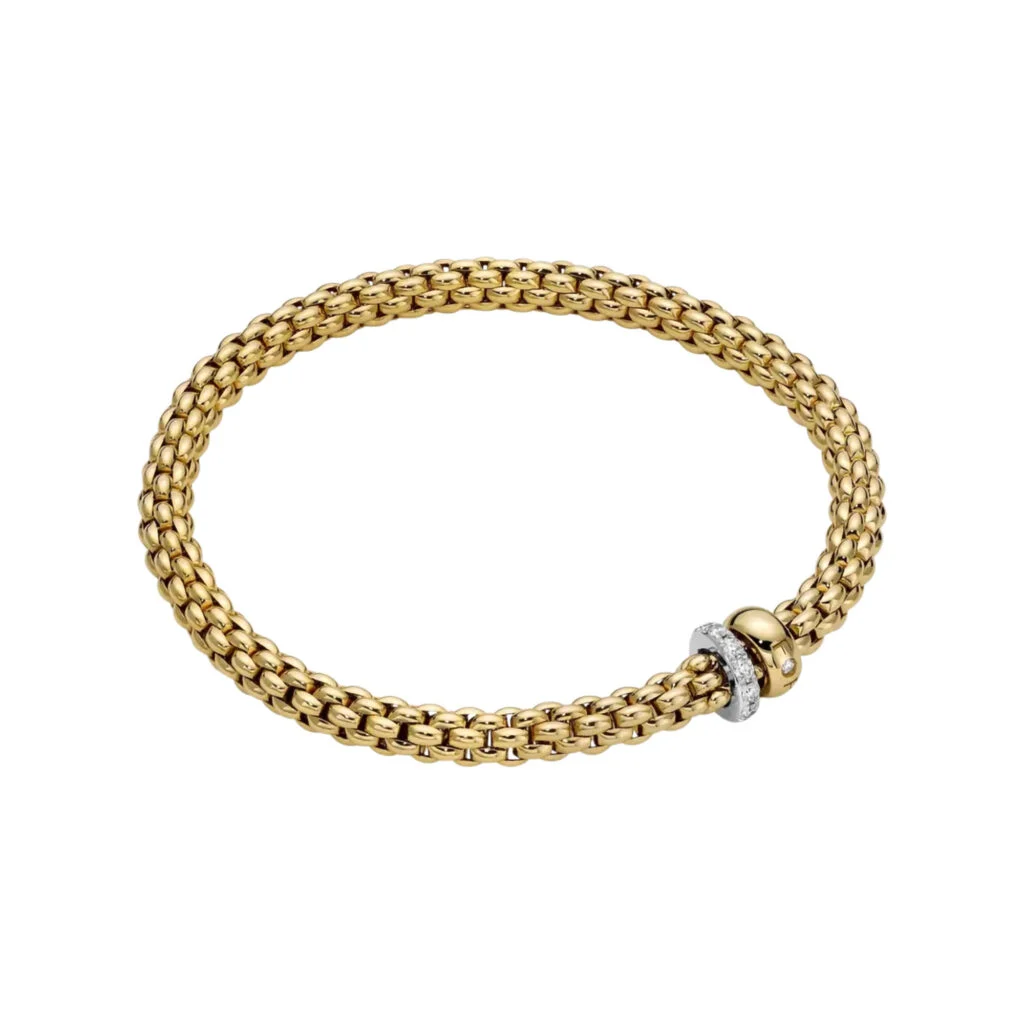 Das Armband Fope 62406BX_PB_G_BGX_00M gehört zur Solo Kollektion und ist aus 18 Karat Gelbgold gefertigt. Es zeichnet sich durch 0,29 Karat Diamanten aus. Dieses mittelgroße, dehnbare Flex’It-Armband verfügt über zwei Diamantronden, wobei die Rondelle aus Weißgold mit einem Diamantpavé besetzt sind und die Rondelle aus Gelbgold einen einzelnen, bündig gesetzten Diamanten aufweisen. Die Kombination aus Fopes charakteristischem Novecento Mesh und luxuriösen Diamantdetails verleiht dem Armband Stil auch Tragekomfort, dank seines flexiblen Designs