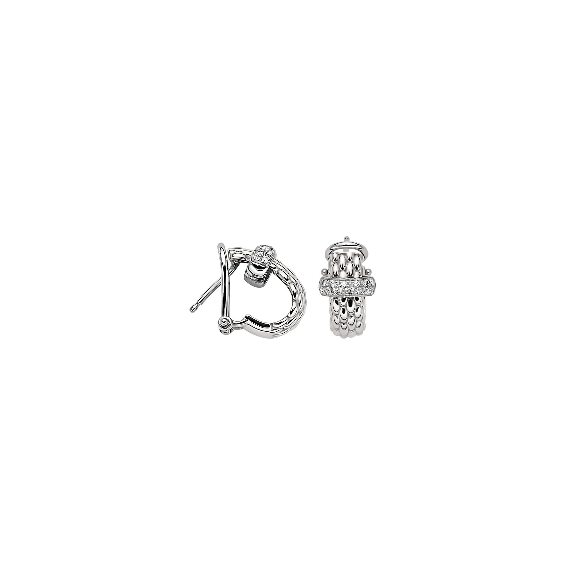 Elegante Creolen aus 750 Weißgold mit ikonischer, flexibler Flechtstruktur für hohen Tragekomfort. Zwei Brillanten à 0,10 ct (GVS1) setzen funkelnde Akzente. Zeitloses Design, italienische Goldschmiedekunst und luxuriöse Zurückhaltung für jeden Anlass.