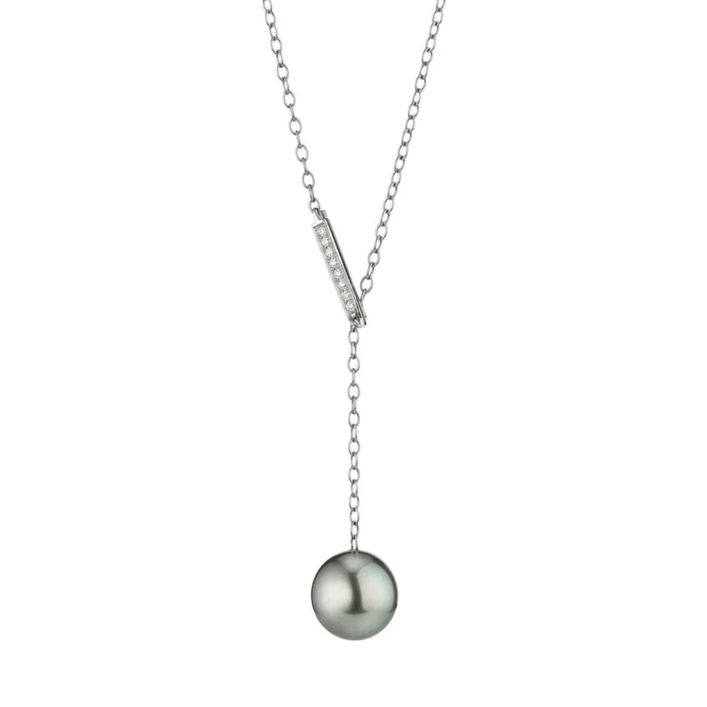 Der Blickfang dieser Halskette ist der fein gearbeitete Anhänger, bestehend aus einem eleganten, diamantbesetzten Element in Stabform und einer kostbaren Tahitiperle. Die Diamanten sind präzise eingefasst und sorgen für ein dezentes Funkeln, das die schlichte Eleganz der Kette unterstreicht. Die schimmernde Tahitiperle am unteren Ende des Anhängers verleiht dem Schmuckstück eine besondere Tiefe und Ausdruckskraft. Ihr dunkler Glanz bringt die moderne Seite der Perle perfekt zur Geltung.