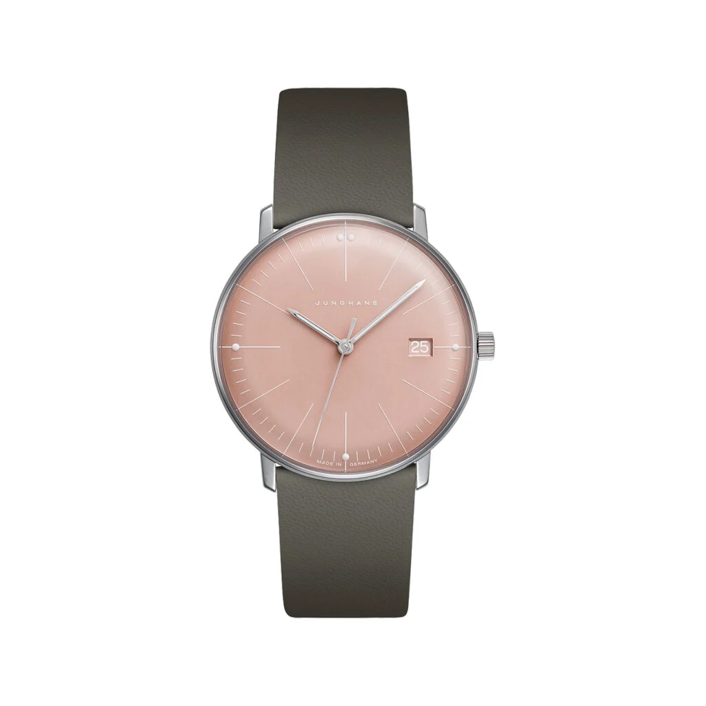 Die Junghans Max Bill Uhr vereint klassisches Design mit moderner Technologie. Sie besitzt ein Edelstahlgehäuse mit einem Durchmesser von 32,7 mm und einem verschraubten Gehäuseboden. Das Zifferblatt ist in Rosé gehalten und unter einem beidseitig entspiegelten Saphirglas platziert, das optimale Lesbarkeit garantiert. Das Quarzuhrwerk Kaliber J643.29 sorgt für präzise Zeitangabe und beinhaltet eine Datumsfunktion. Das elegante Lederarmband mit einer Bandanstoßbreite von 17 mm wird mit einer Dornschließe geschlossen. Die Uhr ist bis zu 5 Bar wasserdicht, was sie sowohl alltagstauglich als auch widerstandsfähig macht