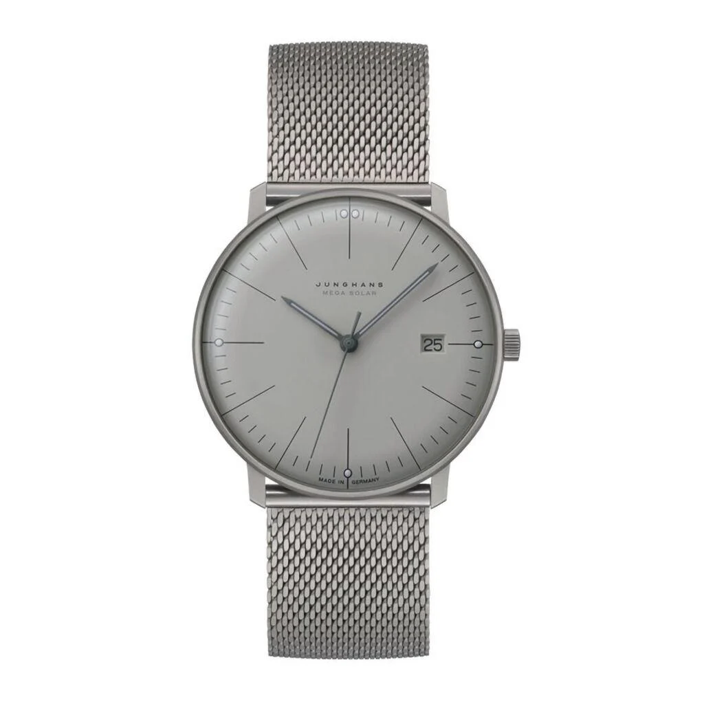 max bill MEGA Solar – Ihr minimalistisches Design bleibt immer modern, ihre Energie schöpft sie aus der Sonne. Dank des Materials Titan erlebt man die Uhr als verblüffend leicht und besonders hautfreundlich. Weiteren Komfort bieten das hochmoderne Funkwerk, ein ewiger Kalender und die einfache Einstellung der Zeitzonen per Krone oder in wenigen Sekunden mit dem Junghans eigenen Zeitsignal der Junghans MEGA App. Auch das Design der max bill MEGA Solar steht ganz im Zeichen der Nachhaltigkeit: Die Bauhaus-typische minimalistische Formensprache bleibt modern – gestern, heute, morgen und übermorgen.