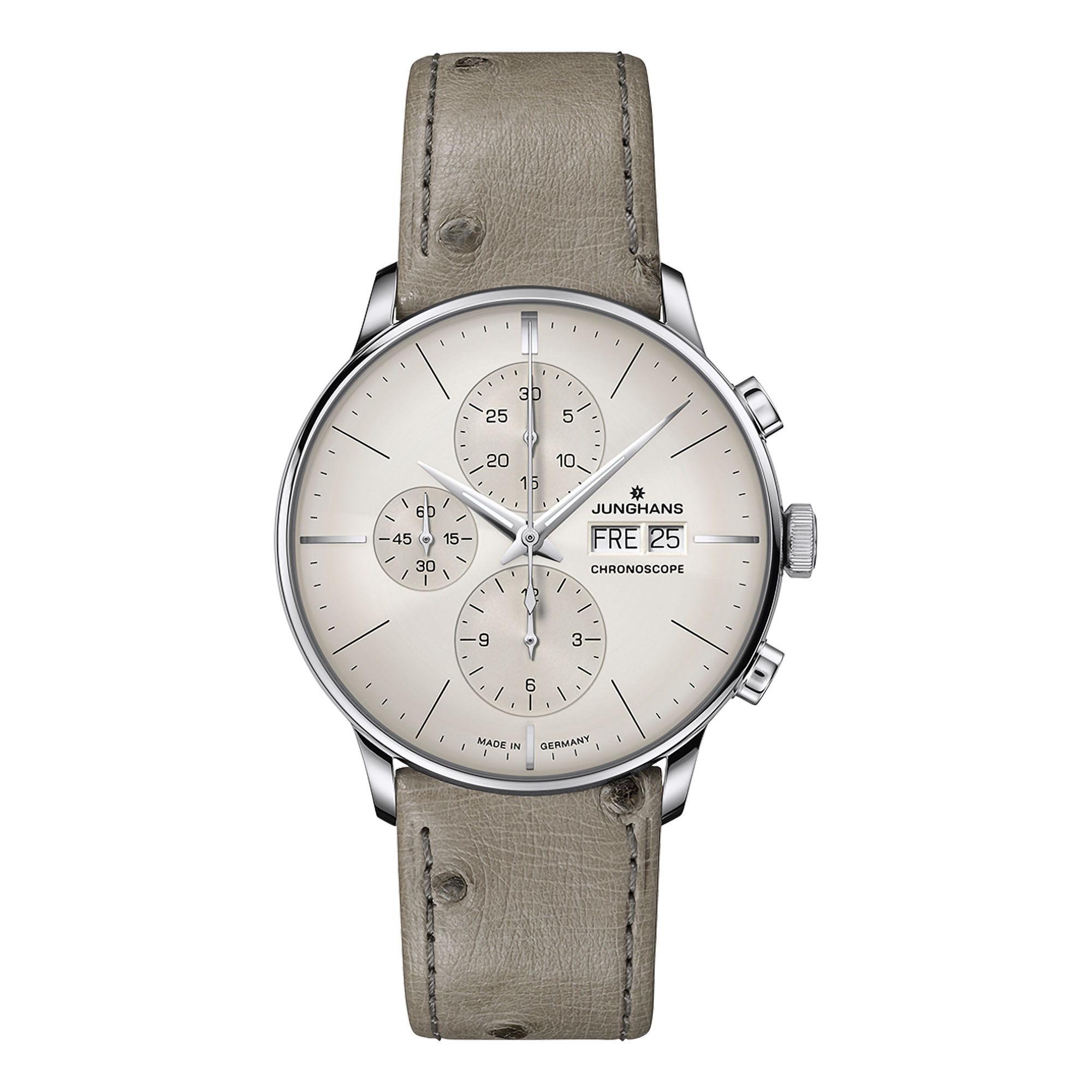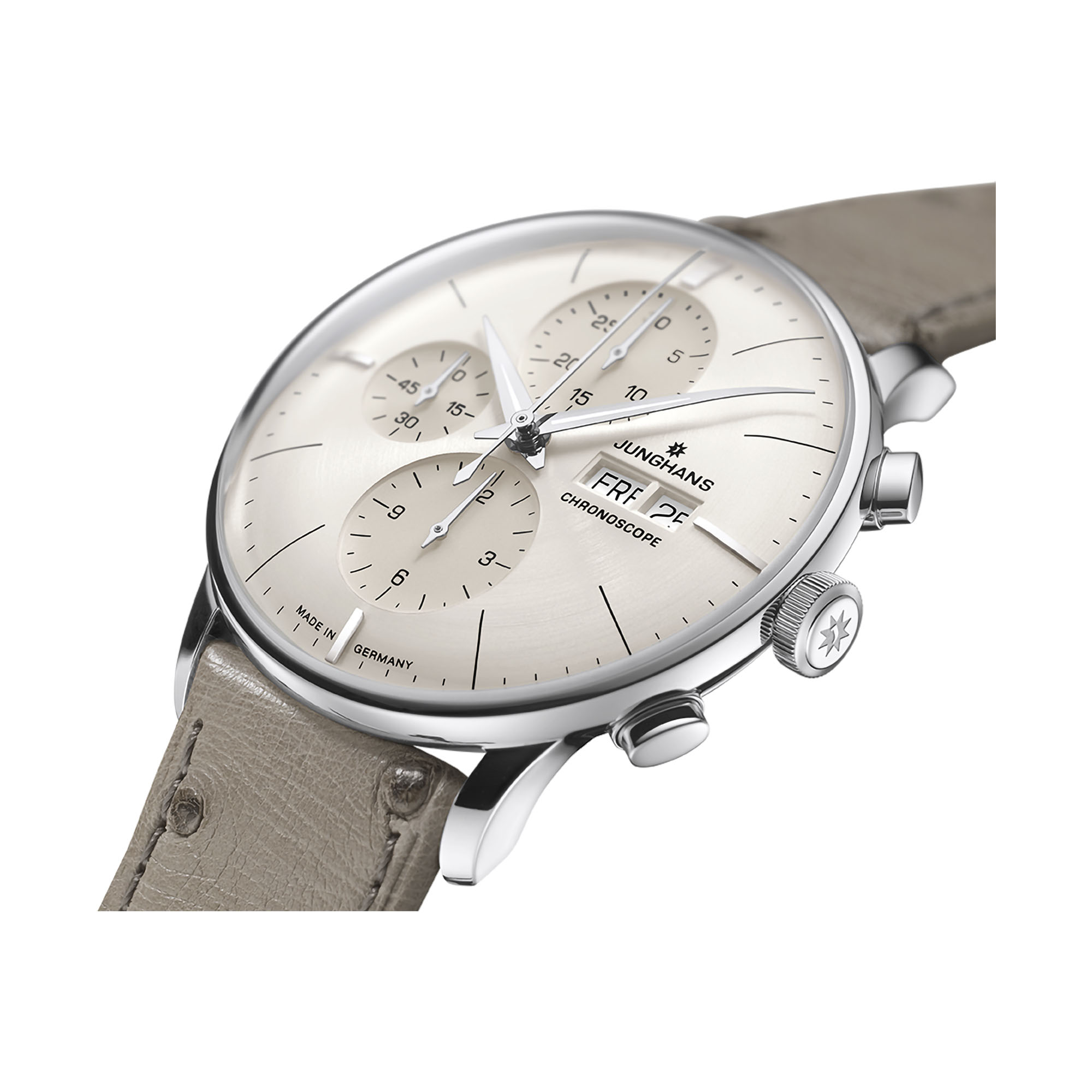 Entdecken Sie die Junghans Meister Chronoscope, eine mechanische Herrenuhr, die deutsche Präzision und zeitloses Design perfekt vereint. Das cremefarbene Ziffernblatt mit klaren Indizes und die Edelstahl-Lünette verleihen dieser Luxusuhr einen eleganten, minimalistischen Charme. Das hochwertige Straußenlederarmband in Beige sorgt für exklusiven Tragekomfort und unterstreicht den premium Look.