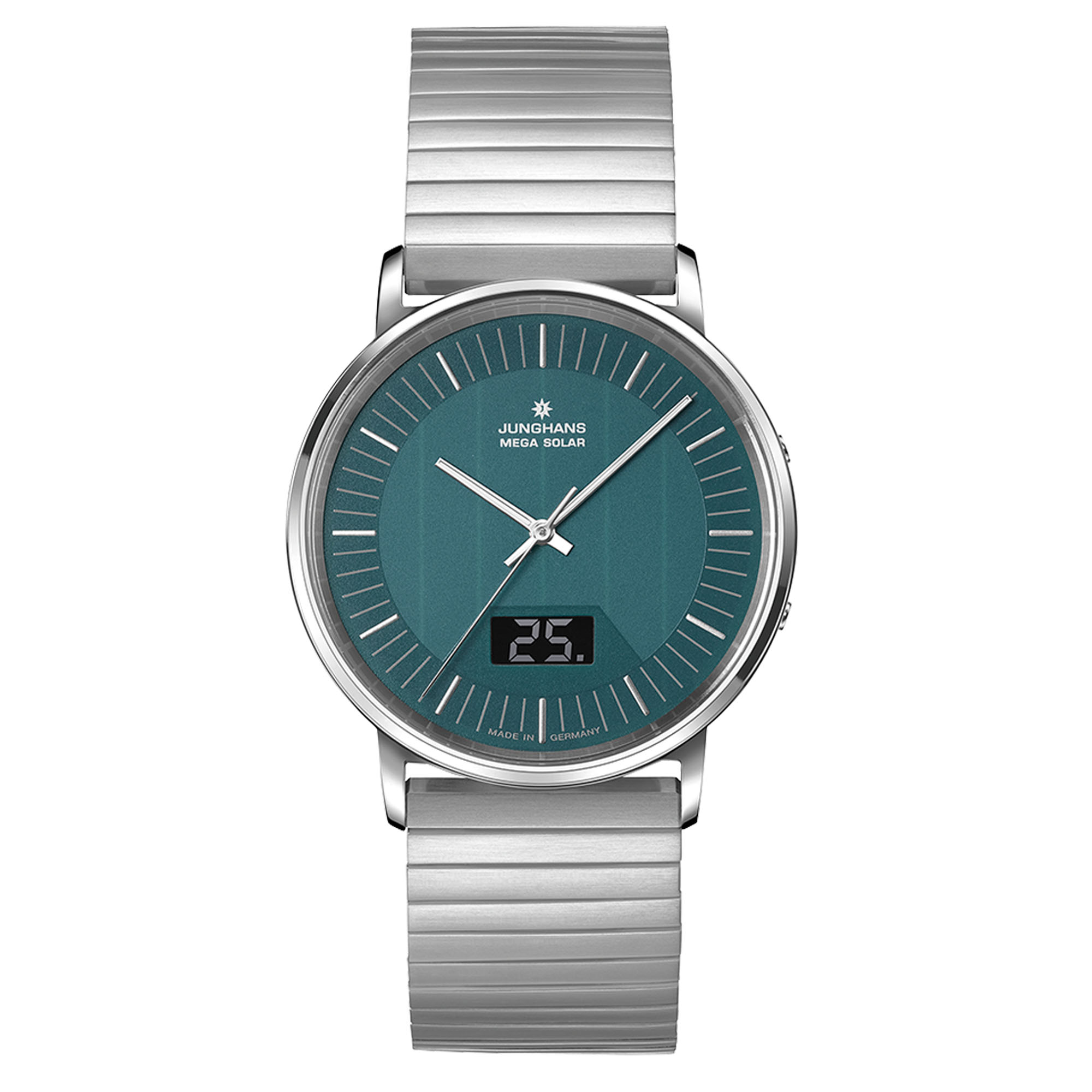 Funk und Solarantrieb: In beiden Technologien hat Junghans Pionierarbeit geleistet. So bietet die Milano Mega Solar ein modernes technisches Innenleben und zeitgemäße Ästhetik. Die Glassolarzifferblätter werden während des Fertigungsprozesses in unserer Schleiferei und Druckerei in zahlreichen Arbeitsschritten bearbeitet. Die Einstellung ist auch per Junghans App möglich.