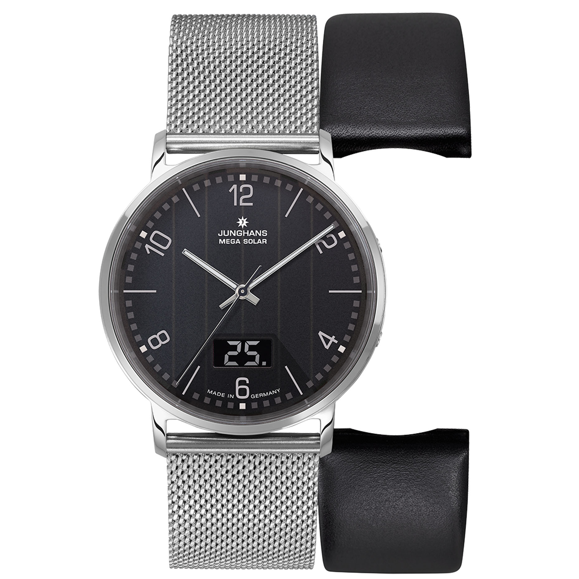 Funk und Solarantrieb: In beiden Technologien hat Junghans Pionierarbeit geleistet. So bietet die Milano Mega Solar modernstes technisches Innenleben in aktuellem Äußeren. Die Glassolarzifferblätter werden während des Fertigungsprozesses in unserer Schleiferei und Druckerei in zahlreichen Arbeitsschritten bearbeitet. Die Einstellung ist auch per Junghans App möglich.