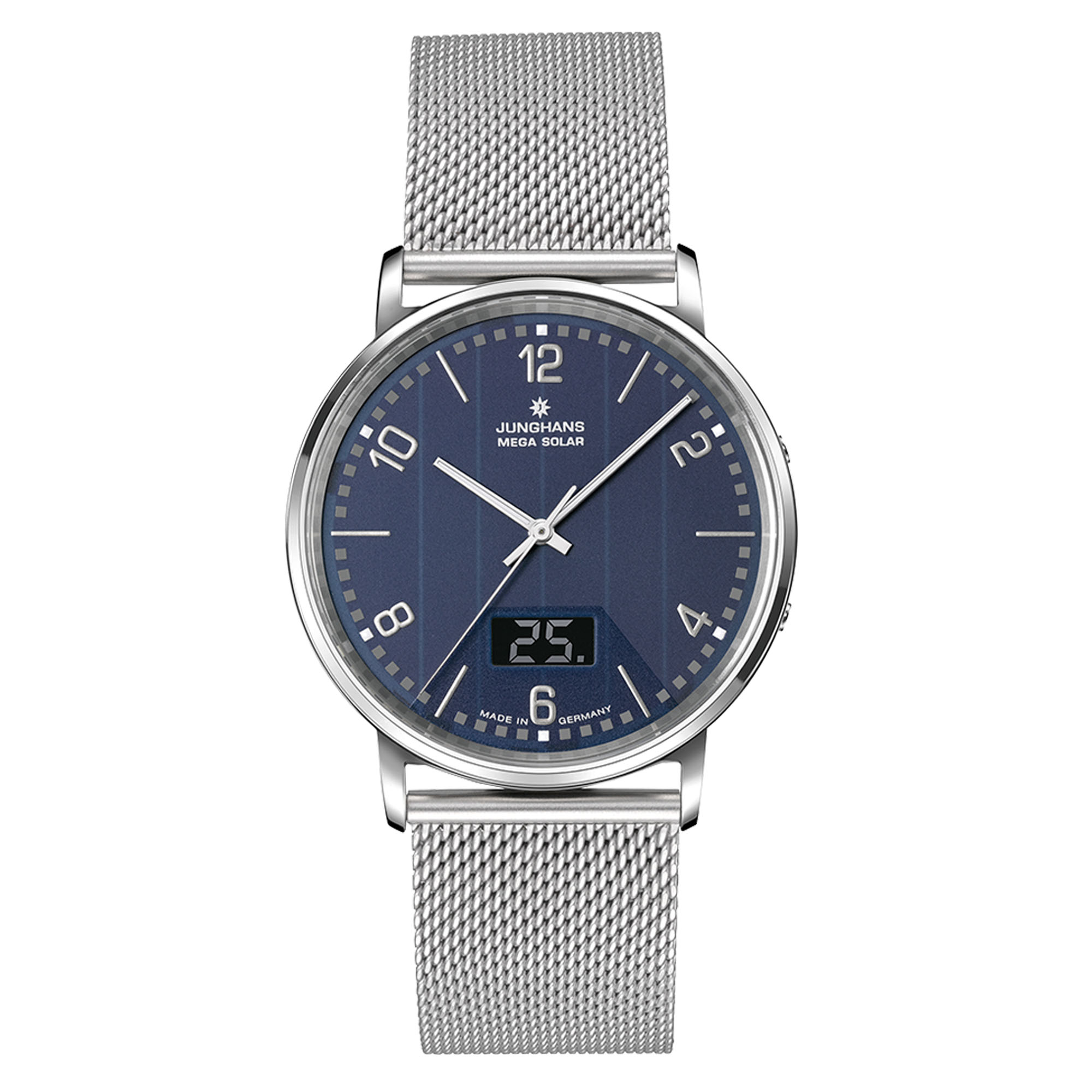 Funk und Solarantrieb: In beiden Technologien hat Junghans Pionierarbeit geleistet. So bietet die Milano Mega Solar ein modernes technisches Innenleben und zeitgemäße Ästhetik. Die Glassolarzifferblätter werden während des Fertigungsprozesses in unserer Schleiferei und Druckerei in zahlreichen Arbeitsschritten bearbeitet. Die Einstellung ist auch per Junghans App möglich.