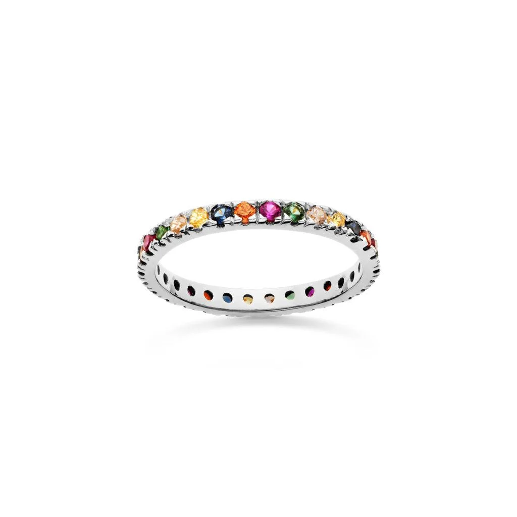 Wunderschöner und eleganter Ring mit einer Reihe von farbigen Zirkonia-Kristallen, die um den Ring herum angeordnet sind. Trage den Ring alleine oder kombiniere ihn mit deinen anderen Ringen.