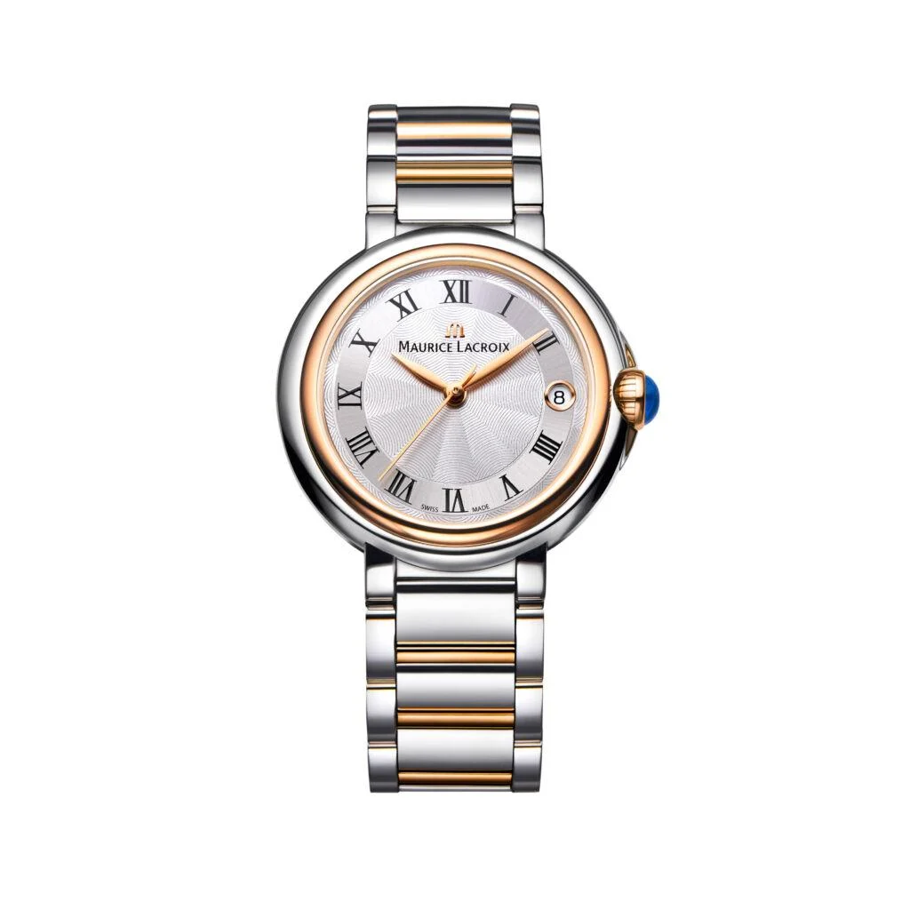 Eine Uhr ohne Ecken und Kanten – die FIABA Date 32mm strahlt Zartheit und Anmut aus, ihr rundes Gehäuse verkörpert Glamour im gleichen Maße wie ihre Trägerinnen selbst. Das betont feminine Design mit dem von Wassertropfen inspirierten Zifferblatt schmiegt sich geradezu an das Handgelenk. Das Bicolor-Modell besitzt die für eine FIABA typische, mit einem blauen Spinell besetzte Krone, die den luxuriösen Look unterstreicht.