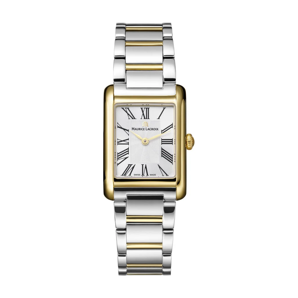 Entdecken Sie die Maurice Lacroix FIABA FA1205-PVY02-110-A – eine Damenuhr, die klassische Schönheit und moderne Raffinesse perfekt miteinander vereint. Das rechteckige Edelstahlgehäuse wird von edlen, goldfarbenen Akzenten eingerahmt und strahlt luxuriöse Zurückhaltung aus. Das fein strukturierte, silberfarbene Zifferblatt mit römischen Ziffern und schlanken Zeigern unterstreicht die zeitlose Ästhetik und bietet eine optimale Ablesbarkeit. Die Kombination aus kühlem Edelstahl und warmem Goldton am Armband verleiht der Uhr eine besondere Note und macht sie zum stilvollen Begleiter für jeden Anlass.