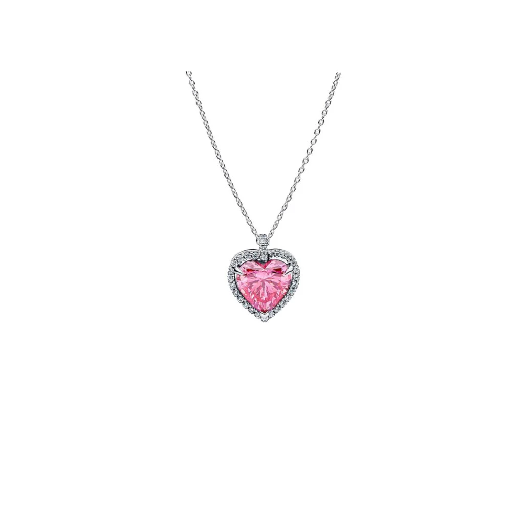 Lehne dich in die Liebe zurück. Diese Halskette aus Sterling-Silber hat einen herzförmigen rosafarbenen Cubic Zirkonia, der von einem Strahlenkranz aus klaren Steinen umrahmt ist. Der Anhänger bewegt sich frei entlang der Kette und fängt mit jedem Schritt das Licht ein.