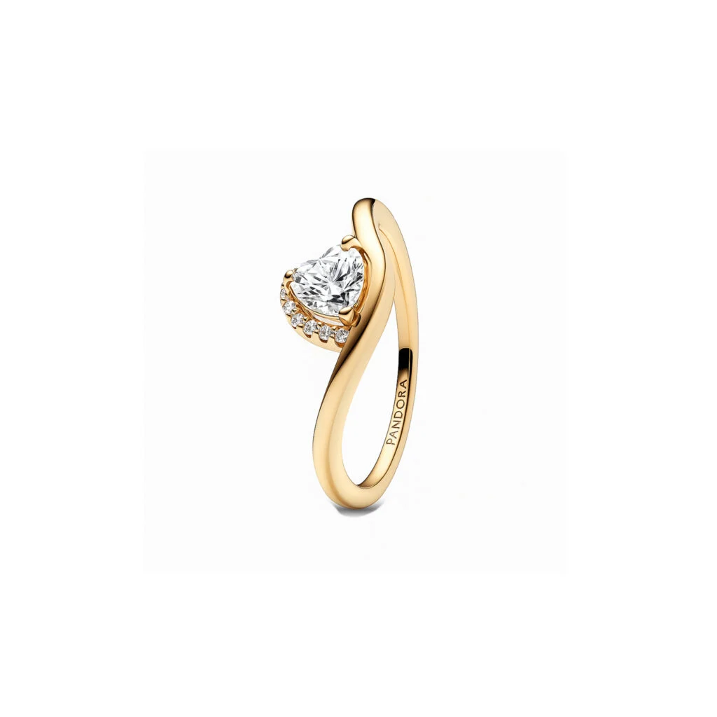 Ein gewelltes Band umschließt einen herzförmigen Stein in diesem besonderen Ringdesign. Er ist mit 14 Karat Gold plattiert und hat einen Cubic Zirkonia im Herzschliff in Krappenfassung mit einem teilweisen Strahlenkranz aus Pavé-Steinen. Ein modernes Schmuckstück mit elegantem, fließendem Design, das perfekt zu deinem goldfarbenen Lieblingsschmuck passt.