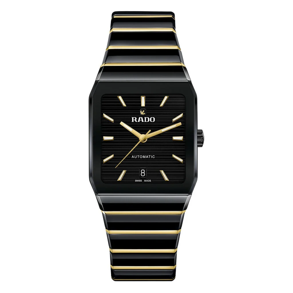 Seit ihrem Debüt im Jahr 1983 ist die Rado Anatom ein Symbol für bahnbrechendes Design und ultimativen Tragekomfort. Ihr charakteristisches Merkmal ist das zylindrische, metallisierte Saphirglas mit facettierten Kanten auf beiden Seiten, das nahtlos in ein Armband aus Plasma Hightech-Keramik übergeht und so eine glatte, durchgehende Form schafft, die Gehäuse und Armband zu einer geschlossenen Einheit verschmelzen lässt. Das aus polierter Plasma Hightech-Keramik und Mittelgliedern aus poliertem roségoldfarbenen PVD-Edelstahl gefertigte Armband wird durch eine Dreifachschließe aus gebürstetem Edelstahl sorgfältig gesichert. Unter dem markanten Glas liegt ein grau lackiertes Zifferblatt, das ein attraktives Muster aus horizontalen Linien aufweist. Die mit weissem Super-LumiNova® versehenen roségoldfarbenen Zeiger und Indizes bilden einen raffinierten Kontrast, der dem Zifferblatt zusätzlich Tiefe verleiht. Gekrönt wird das Zifferblatt mit dem ikonischen beweglichen Anker bei 12 Uhr, ergänzt durch ein diskretes Datumsfenster bei 6 Uhr. Herzstück der Uhr ist das Automatikwerk Kaliber R766 mit 21 Steinen, das durch den Gehäuseboden aus Saphirglas zu sehen ist. Das in fünf Lagen fein justierte Uhrwerk ist mit einer Nivachron™ Spiralfeder ausgestattet und bietet eine hohe Ganggenauigkeit sowie eine robuste Gangreserve von 72 Stunden. Dies unterstreicht den hohen Stellenwert, den Rado der Perfektion beimisst.
