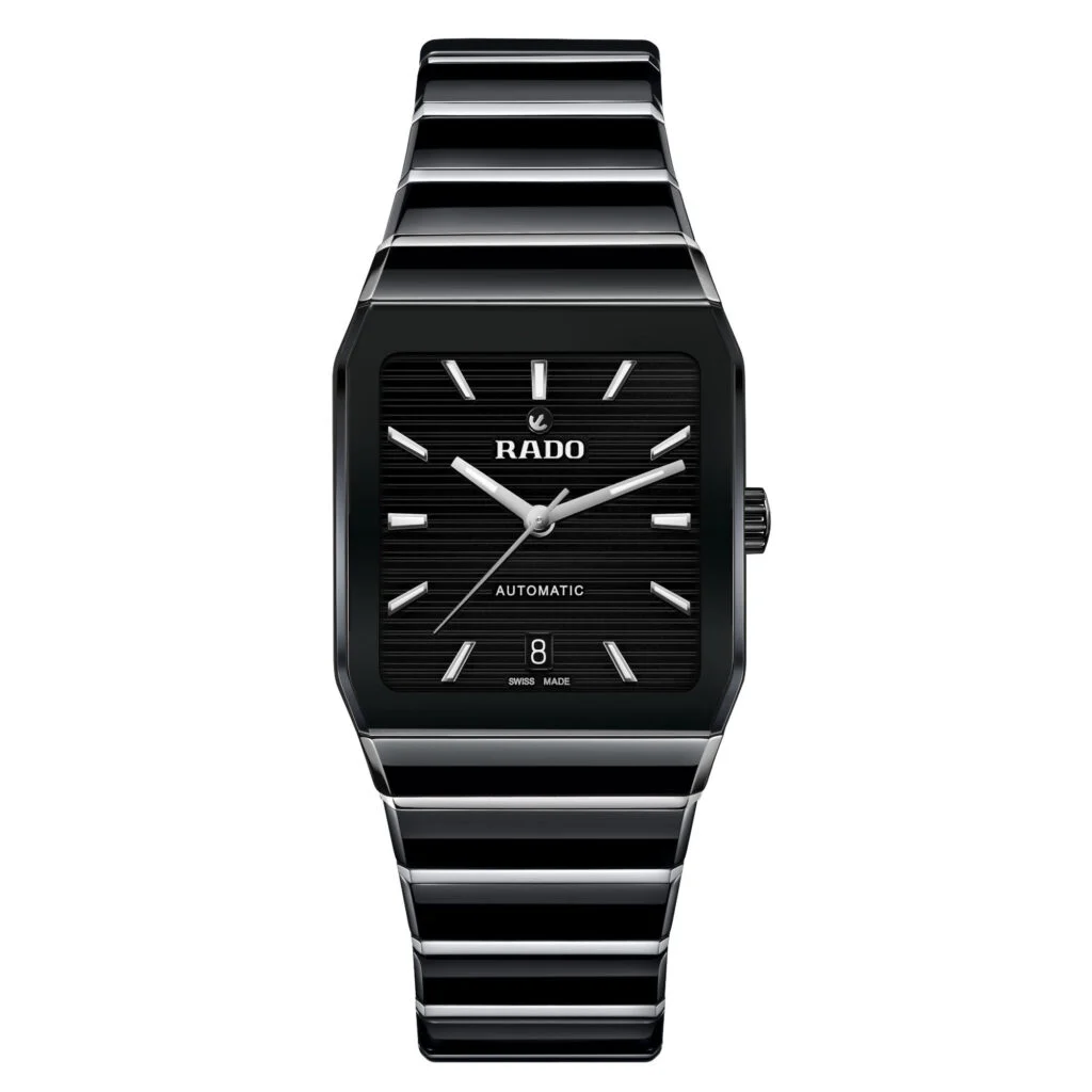 Das quadratische Gehäuse mit weichen Kanten und das vertikal gestreifte Zifferblatt verleihen der Uhr einen unverwechselbaren Charakter. Die schlanken Zeiger und die diskrete Datumsanzeige bei 8 Uhr unterstreichen den minimalistischen Stil. Das integrierte Keramik-Armband mit präziser Faltschließe sorgt für perfekten Tragekomfort – Tag und Nacht.