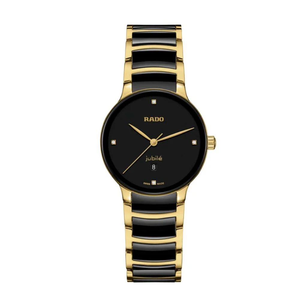 Diese Uhr spiegelt die Kunstfertigkeit von Rado wider, beginnend mit dem exquisit gewölbten Saphirglas, das bis zum Rand des sanft gerundeten Gehäuses reicht und eine nahtlose Ästhetik bietet. Das Gehäuse selbst, veredelt mit einer gelbgoldfarbenen PVD-Beschichtung, und die schwarzen Hightech-Keramik-Mittelglieder des Armbands bieten einen zeitlosen Look.