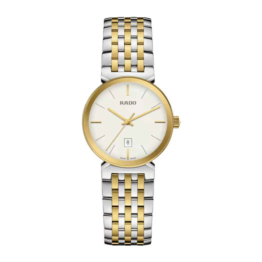 Entdecken Sie die Faszination einer Rado Uhr, die mit ihrem klaren, weißen Zifferblatt und dem zweifarbigem Edelstahl-Gold-Armband jeden Look veredelt. Das schlanke, runde Gehäuse und die goldenen Zeiger verleihen ihr einen Hauch von Luxus, während das präzise Quarzuhrwerk für absolute Zuverlässigkeit sorgt. „Swiss Made“ steht hier für höchste Handwerkskunst und zeitloses Design.