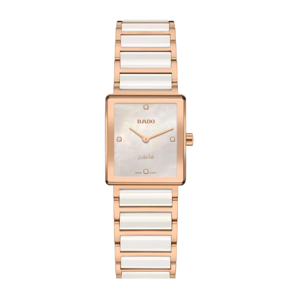 Ein Blick genügt, um die Rado Integral zu erkennen: ikonisches Design, ein puristisches Zifferblatt und ein schlankes, rechteckiges Gehäuse aus poliertem roségoldfarbenen PVD-Edelstahl. Und doch hebt sich dieses Modell durch sein schimmerndes Perlmutt-Zifferblatt, roségoldfarbene Zeiger und eine roségoldfarbene Metallisierung deutlich hervor. Das leicht verjüngte Armband aus Edelstahl mit roségoldfarbener PVD-Beschichtung und Gliedern aus polierter weisser Hightech-Keramik ist perfekt auf die harmonischen Proportionen des rechteckigen Gehäuses abgestimmt. Unübertroffener Stil und Komfort vereinen sich im entspiegelten, randlos gewölbten und facettierten Saphirglas, unter dem das Zifferblatt seine volle Strahlkraft entfaltet. Das minimalistische Design trifft auf das robuste R209 Quarzuhrwerk, das für eine zuverlässige Zeitmessung sorgt. Das Saphirglas und die Hightech-Keramikglieder vereinen luxuriösen Tragekomfort mit raffiniertem Design. Die Wölbung des Glases setzt sich im Armband fort, das sich sanft an die Rundung Ihres Handgelenks schmiegt. Der Inbegriff von Stil und Eleganz: die Rado Integral in Weiss und Roségoldfarben, veredelt durch ein Zifferblatt aus schimmerndem Perlmutt.