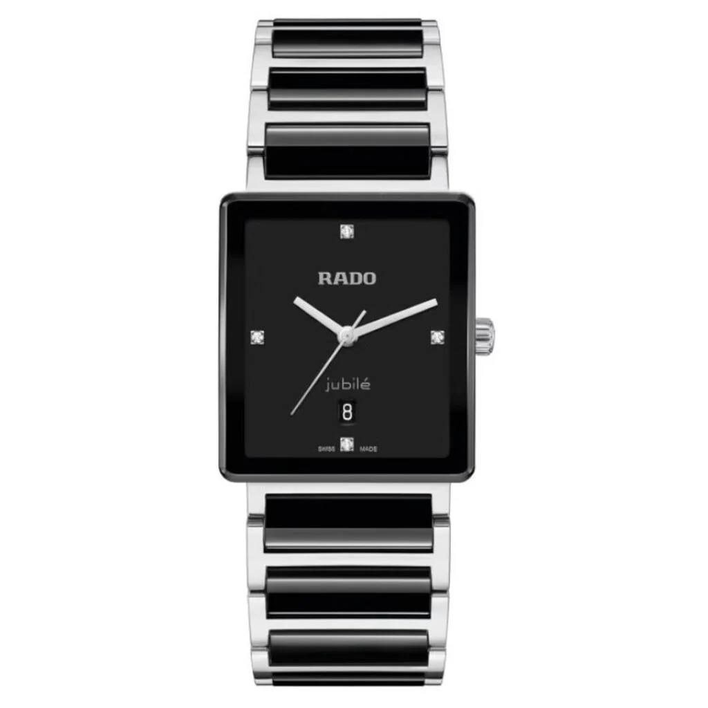 Mit Ihrem ausgeprägten Sinn für Stil und Qualität wählen Sie selbstverständlich nur das Beste – und genau deshalb entscheiden Sie sich für die Rado Integral. Das schlanke, elegante Gehäuse aus poliertem Edelstahl bewahrt die für die Rado Integral charakteristische rechteckige Form. Seine Proportionen sind zudem auf das leicht konisch zulaufende Armband abgestimmt – für einen noch grösseren ästhetischen Genuss beim Anblick der Uhr. Das Gehäuse wird von einem gewölbten, facettierten Saphirglas mit Antireflexbeschichtung und schwarzer Metallisierung vollendet. Das Zifferblatt ist schwarz lackiert und mit den traditionellen vier Top-Wesselton-Diamanten bei 3, 6, 9 und 12 Uhr, silberfarbenen Rado und Jubilé Logos sowie rhodinierten Zeigern ausgestattet. Dabei zeichnet sich dieses ikonische Rado Design durch sein grosses, leicht ablesbares Zifferblatt und Hightech-Materialien für maximalen Tragekomfort aus. Das Rado Quarzuhrwerk R218 garantiert eine präzise Zeitmessung – zuverlässig und konform mit dem Schweizer Standard für zertifizierte Chronometer. Mit ihrem zylindrischen Saphirglas und dem luxuriösen Charakter der schwarzen Hightech-Keramikglieder im Edelstahl-Armband ist die Rado Integral die perfekte Ergänzung für Ihr ausgeprägtes Stilbewusstsein. Unweigerlich fällt der Blick auf das gewölbte Glas, das sich harmonisch der Form Ihres Handgelenks anpasst – ein dezenter Ausdruck von Eleganz, Komfort und Raffinesse.