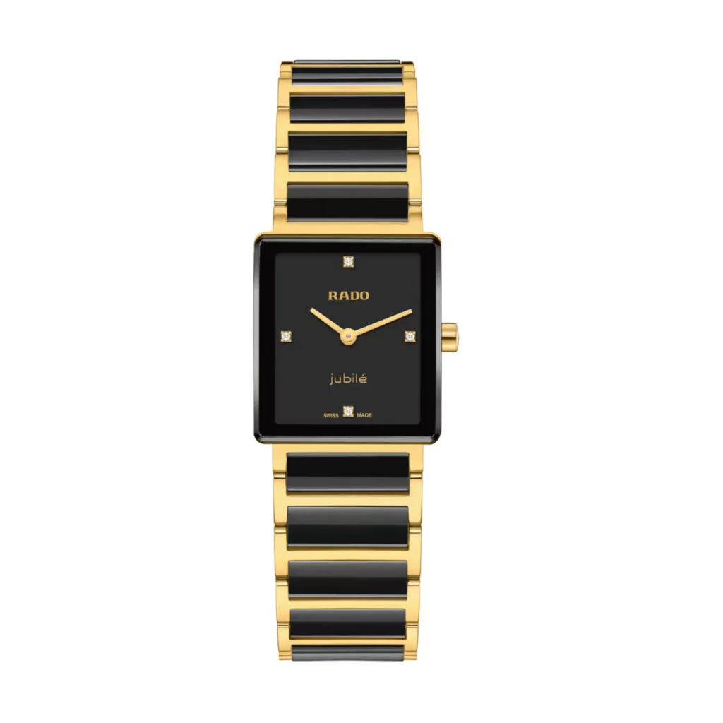 Sie schätzen Qualität, Stil und das Besondere – denn für Sie kommen nur die schönsten Dinge in Frage. Mit ihrem klassischen Rado Zifferblatt, veredelt durch vier Diamanten, und dem charakteristischen Tragekomfort erfüllt die Rado Integral Ihre Ansprüche mühelos. Das Edelstahlgehäuse ist gelbgoldfarben ausgeführt, ebenso wie die Zeiger, die über die Diamanten auf dem Zifferblatt gleiten. Das gelbgoldfarbene Armband aus Edelstahl rahmt Mittelglieder aus glänzend schwarzer Hightech-Keramik ein. Das randlose, gewölbte und facettierte Saphirglas mit schwarzer Metallisierung ist einseitig entspiegelt – für optimale Ablesbarkeit bei jedem Licht. Für optimalen Tragekomfort am Handgelenk sorgen ein schlankes Gehäuseprofil und Bandglieder aus Hightech-Keramik. Das schwarz lackierte Zifferblatt mit aufgedrucktem gelbgoldfarbenem Rado und Jubilé Logo unterstreicht die minimalistische Ästhetik, während das Quarzuhrwerk R209 mit 6 Steinen und zwei Zeigern rund um die Uhr eine präzise Zeitmessung garantiert. Ein subtiles Detail für Liebhaber:innen feiner Gestaltung: Die gewölbte Form des Glases geht fließend in das Armband über, das sich angenehm an die Kontur Ihres Handgelenks schmiegt.