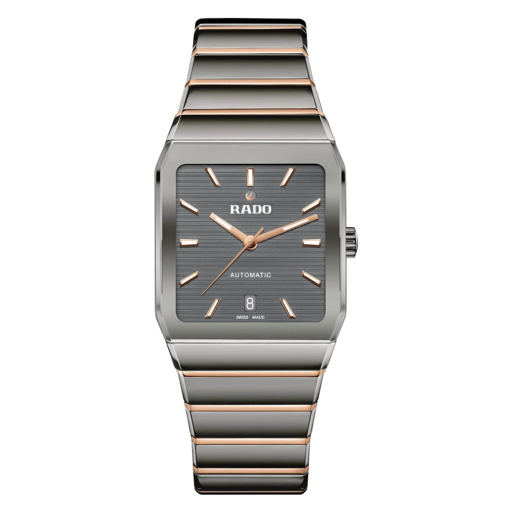 Seit ihrem Debüt im Jahr 1983 ist die Rado Anatom ein Symbol für bahnbrechendes Design und ultimativen Tragekomfort. Ihr charakteristisches Merkmal ist das zylindrische, metallisierte Saphirglas mit facettierten Kanten auf beiden Seiten, das nahtlos in ein Armband aus Plasma Hightech-Keramik übergeht und so eine glatte, durchgehende Form schafft, die Gehäuse und Armband zu einer geschlossenen Einheit verschmelzen lässt. Das aus polierter Plasma Hightech-Keramik und Mittelgliedern aus poliertem roségoldfarbenen PVD-Edelstahl gefertigte Armband wird durch eine Dreifachschließe aus gebürstetem Edelstahl sorgfältig gesichert. Unter dem markanten Glas liegt ein grau lackiertes Zifferblatt, das ein attraktives Muster aus horizontalen Linien aufweist. Die mit weissem Super-LumiNova® versehenen roségoldfarbenen Zeiger und Indizes bilden einen raffinierten Kontrast, der dem Zifferblatt zusätzlich Tiefe verleiht. Gekrönt wird das Zifferblatt mit dem ikonischen beweglichen Anker bei 12 Uhr, ergänzt durch ein diskretes Datumsfenster bei 6 Uhr. Herzstück der Uhr ist das Automatikwerk Kaliber R766 mit 21 Steinen, das durch den Gehäuseboden aus Saphirglas zu sehen ist. Das in fünf Lagen fein justierte Uhrwerk ist mit einer Nivachron™ Spiralfeder ausgestattet und bietet eine hohe Ganggenauigkeit sowie eine robuste Gangreserve von 72 Stunden. Dies unterstreicht den hohen Stellenwert, den Rado der Perfektion beimisst.