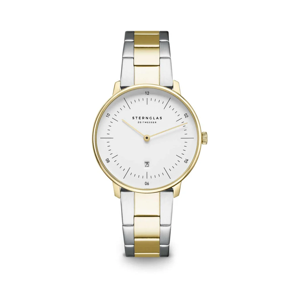 Entdecken Sie die Sternglas Naos XS (S01-ND02-ME07) – eine Uhr, die mit ihrem 33-mm-Goldgehäuse und dem zweifarbigen Edelstahlarmband (gold/silber) puren Bauhaus-Stil und moderne Ästhetik vereint. Mit nur 6 mm Gehäusehöhe gleitet sie elegant unter jeden Ärmel und ist der perfekte Begleiter für schmale Handgelenke – ob im Büro oder beim Abendessen.
