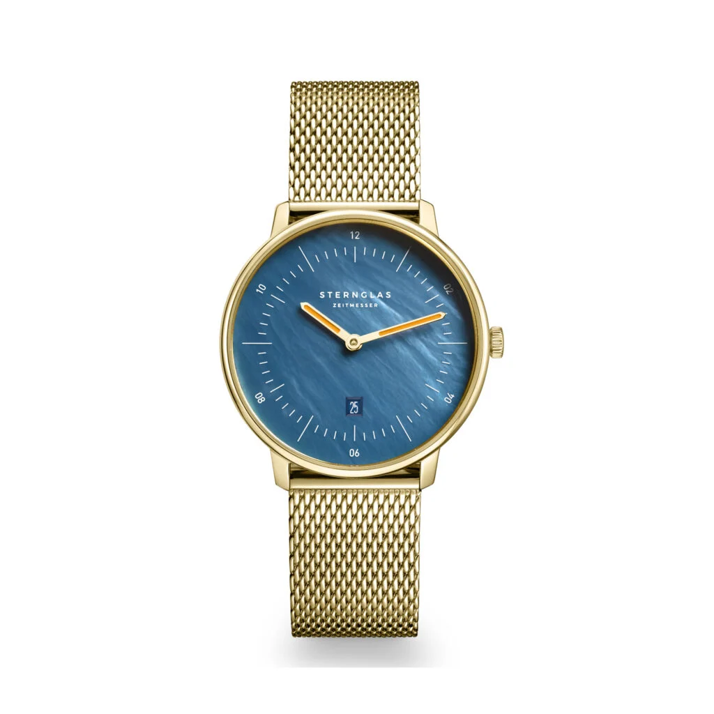 Tauchen Sie ein in die faszinierende Welt der Sternglas Naos XS Edition Perlmutt (S01-NDP07-MI07) – eine Uhr, die mit ihrem dunkelblauen Perlmutt-Ziffernblatt und dem goldfarbenen Edelstahlgehäuse (316L, PVD-beschichtet) den Glanz des Meeres und die Eleganz des Bauhaus-Designs vereint. Mit nur 6 mm Gehäusehöhe gleitet sie sanft unter jeden Ärmel und ist der perfekte Begleiter für schmale Handgelenke – ob im Büro oder bei festlichen Anlässen.