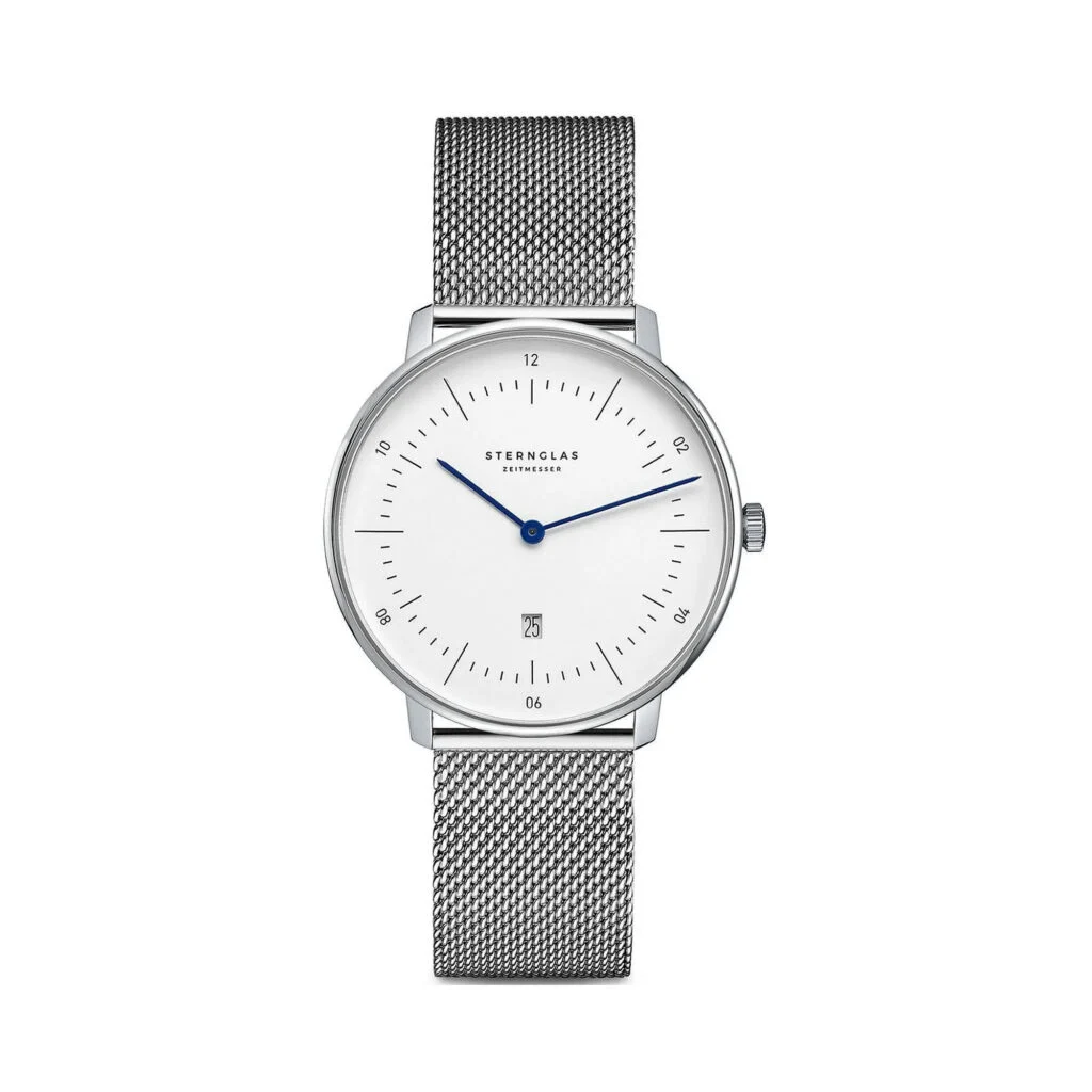 Entdecken Sie die Sternglas Naos XS (S01-ND01-MI01) – eine Uhr, die mit ihrem schlichten weißen Ziffernblatt, dem 33-mm-Edelstahlgehäuse und dem edlen Milanaise-Armband aus Stahlgeflecht puren Bauhaus-Stil verkörpert. Mit nur 6 mm Gehäusehöhe ist sie der perfekte Begleiter für schmale Handgelenke und jeden Anlass, ob im Büro oder beim Abendessen.
