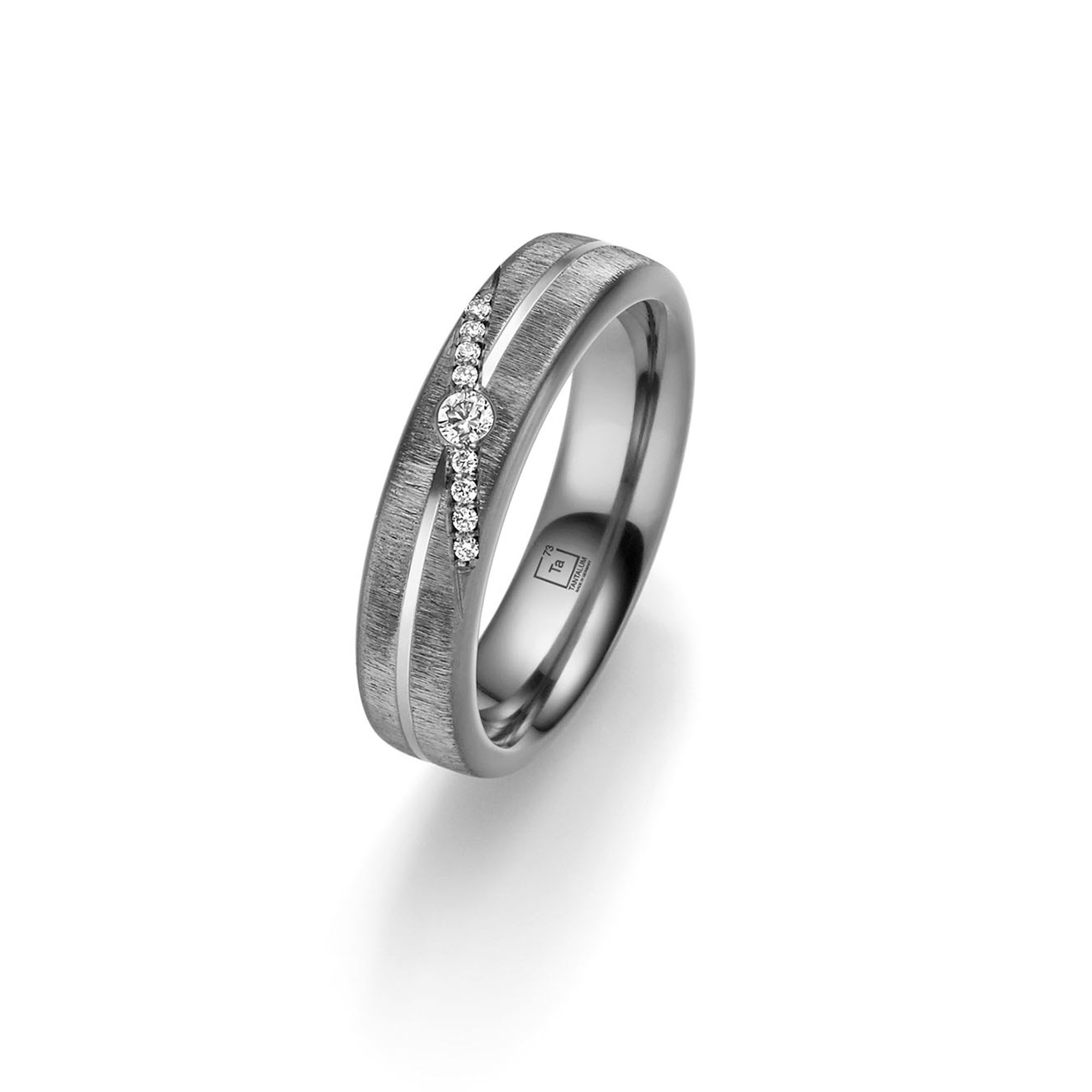 Eine kontrastreiche und zugleich zeitlose Komposition: Die Kombination aus Tantal mit einer Einlage aus Platin lässt diesen Trauring sowohl klassisch als auch modern wirken. Die Oberfläche „Rough“ setzt die Diamanten gekonnt in Szene und verleiht dem Ring eine einzigartige Optik.